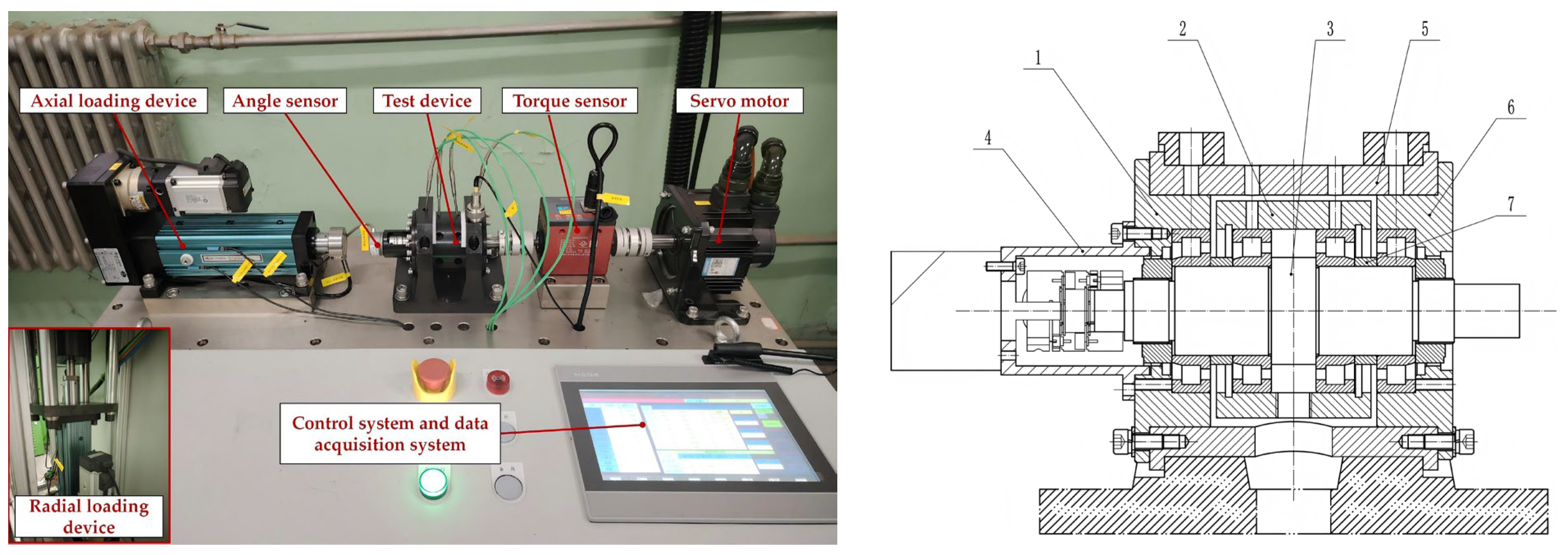 Figure 21. Bearing Micro-Wear Test Bench (1. Left bushing; 2. Middle bushing; 3. Main shaft; 4. Bracket; 5. Test chamber; 6. Right bushing; 7. Inner Race Spacer).
