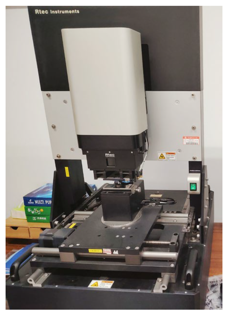 Tests showed that the Cr-CrN-GLC film has an elastic modulus of 175 GPa and a Poisson’s ratio of 0.2. Subsequently, ball-on-disc fretting tests were conducted using an MFT-5000 friction and wear tester manufactured by Rtec-Instruments, USA (Figure 1). A GCr15 steel ball (Φ 9.5 mm) and a 42CrMo4 disc (Φ 24 × 7 mm) were subjected to 36,000 cycles under a normal force of 30 N, a frequency of 5 Hz, and a displacement amplitude of 100 μm. The parameters of the MFT-5000 testing machine are shown in Table 2.