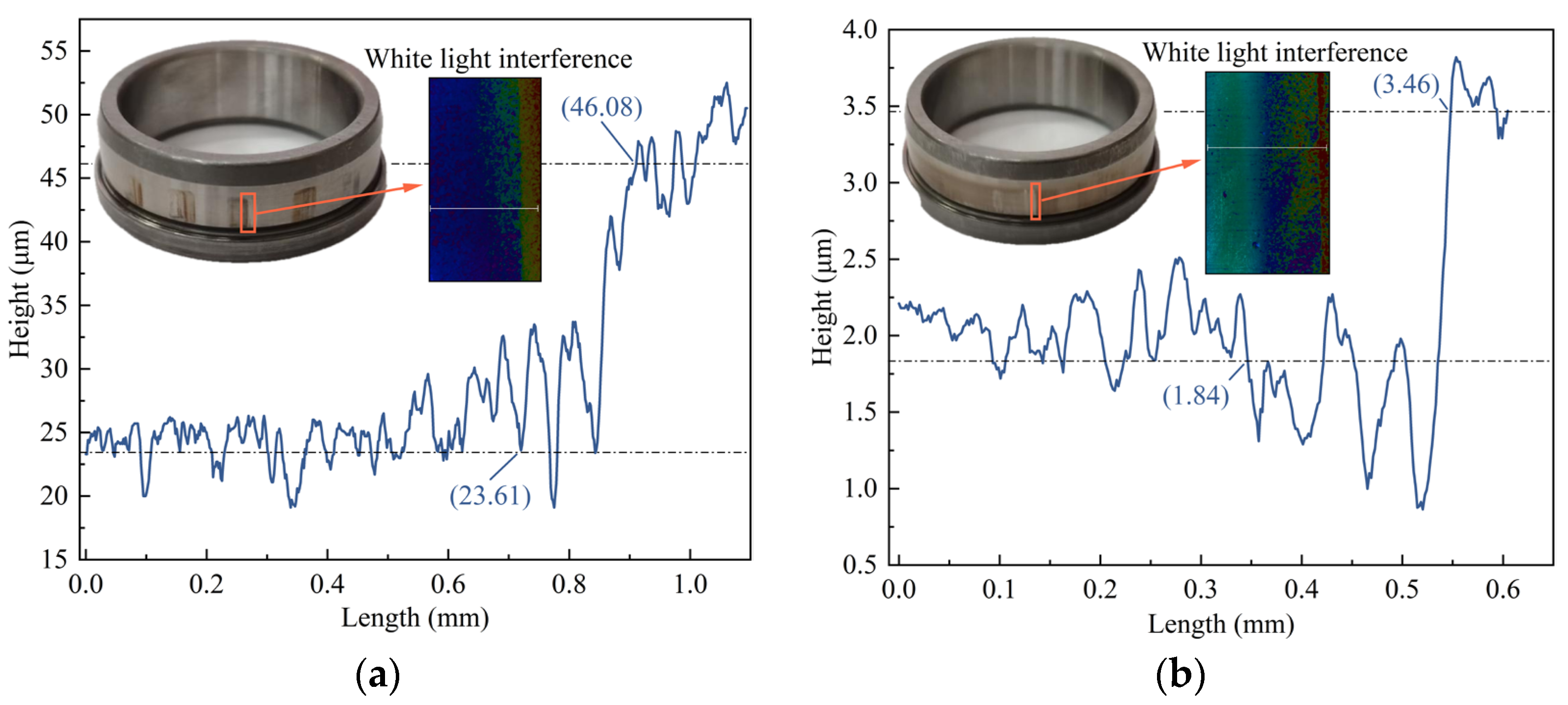 Figure 23. Test the fretting wear depth of the inner ring of the bearing. (a) Uncoated; (b) Coated.