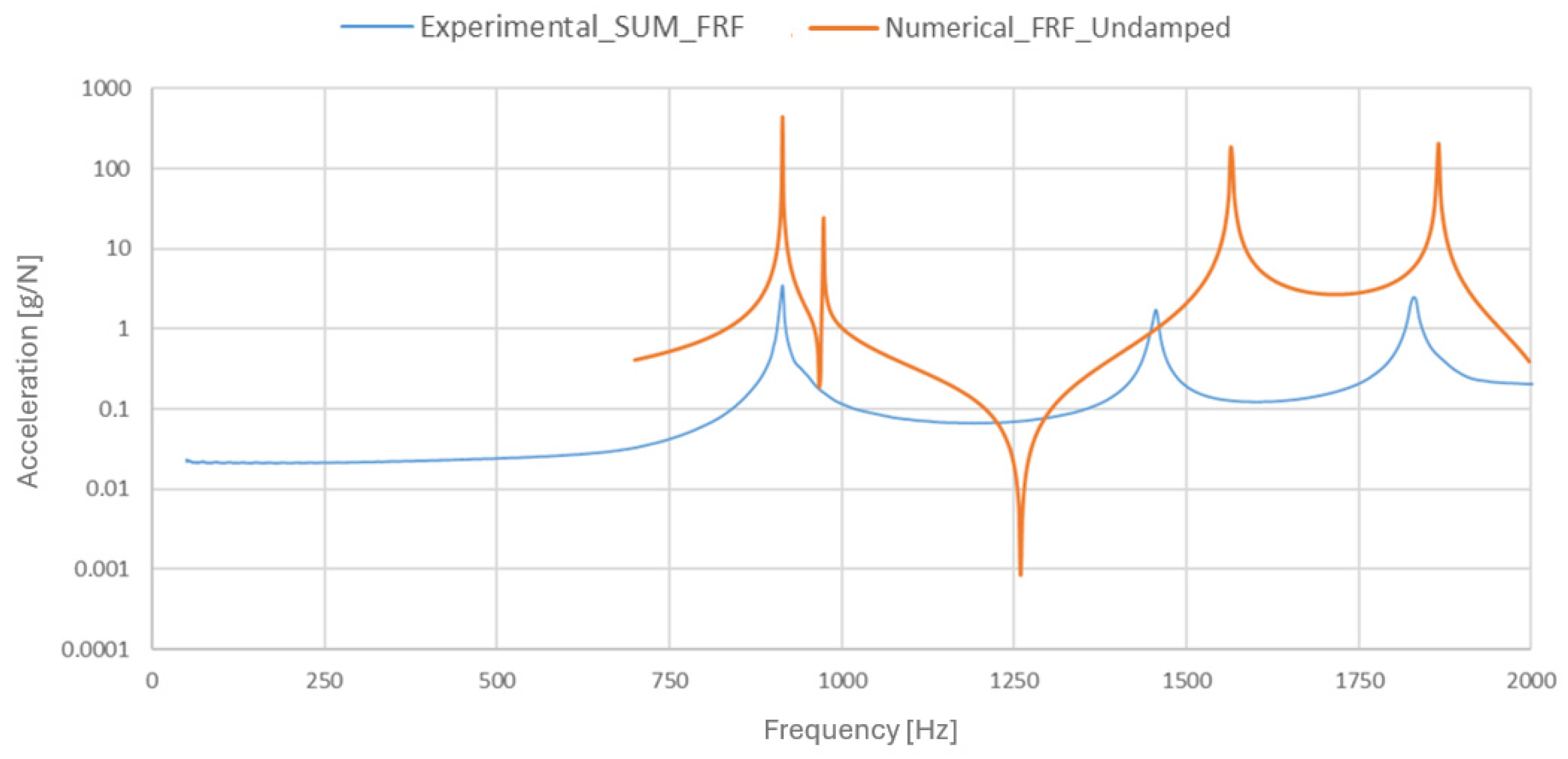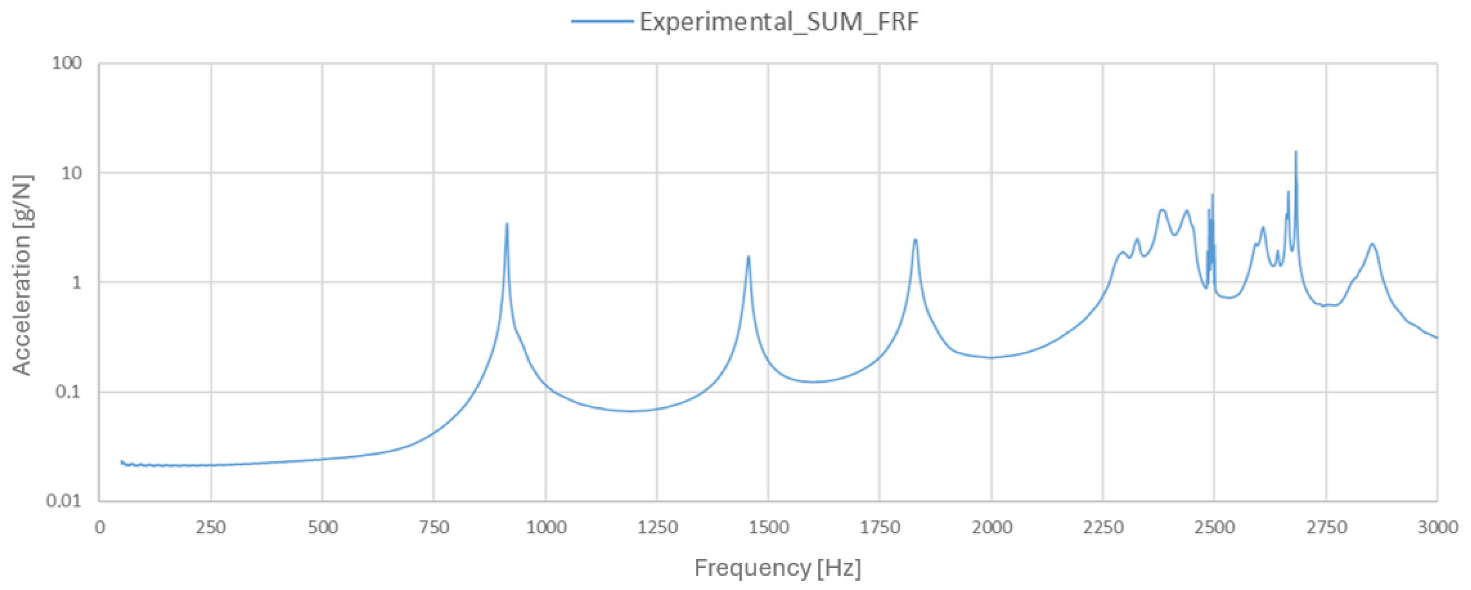 - Peres, M.A.; Bono, R.W.; Avitabile, P. Effects of shaker, stinger and transducer mounting on measured frequency response functions. In Proceedings of the ISMA 2012 International Conference on Noise and Vibration Engineering, Leuven, Belgium, 17–19 September 2012; pp. 1475–1489. [Google Scholar]