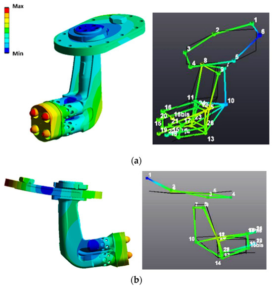 Table 2 illustrates the mode pairs that were considered for the final comparison, which was restricted to those associated with the highest mass participation factors. The maximum frequency deviation was 7%, which is a value considered acceptable in the present context. Such tolerance is justified by the prototyping stage of the component, where the primary objective is to establish a reliable correlation between numerical predictions and experimental measurements rather than to achieve perfect numerical accuracy. In early development phases, deviations of this order are commonly tolerated, as they do not compromise the identification of the main dynamic features of the system. Moreover, in terms of mode shapes, the correlation was found to be satisfactory, as shown in Figure 11, further supporting the robustness of the adopted methodology.