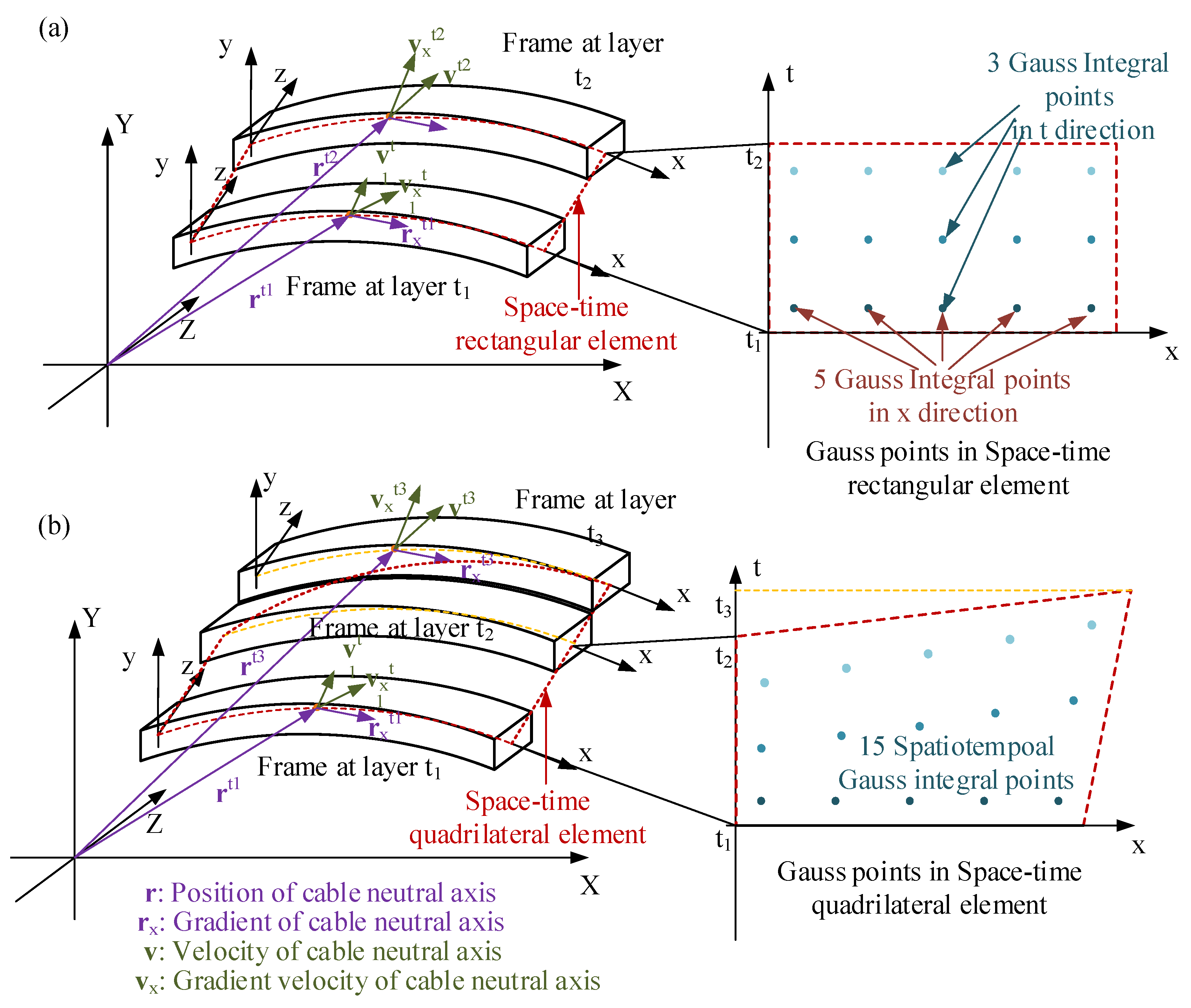 Usually, the dynamic solution of ANCF can be described as a spatiotemporal dynamic problem by considering the velocity in the displacement field as a time gradient. The main difficulty in considering gradients in space and time direction is how to construct high-order space-time functions. Chen et al. [