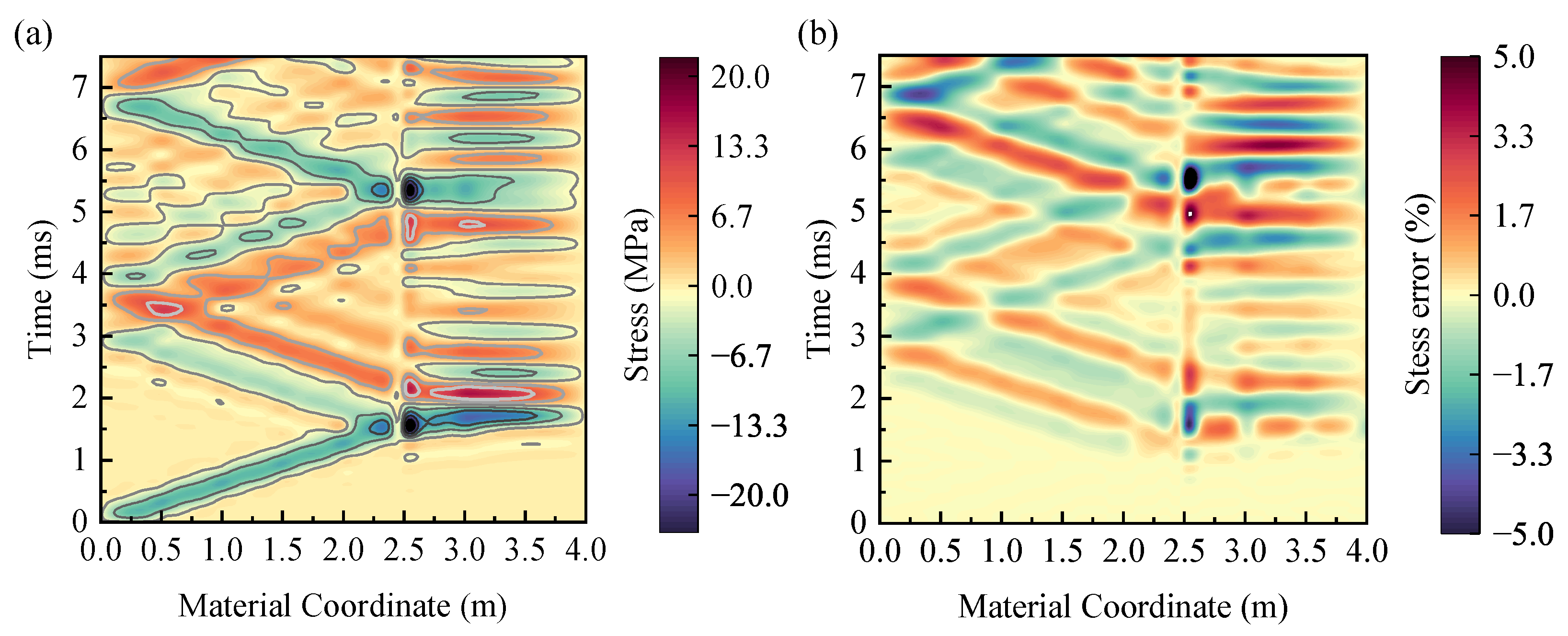 Figure 8b. The slopes of two characteristic lines indicate the longitudinal wave velocity in two different materials, which are 1570 m/s and 4709 m/s, respectively. Between the boundaries of two segments, both methods show the transmission and reflection of the longitudinal wave. The transmission and reflection rates of elastic material are given in Equation (