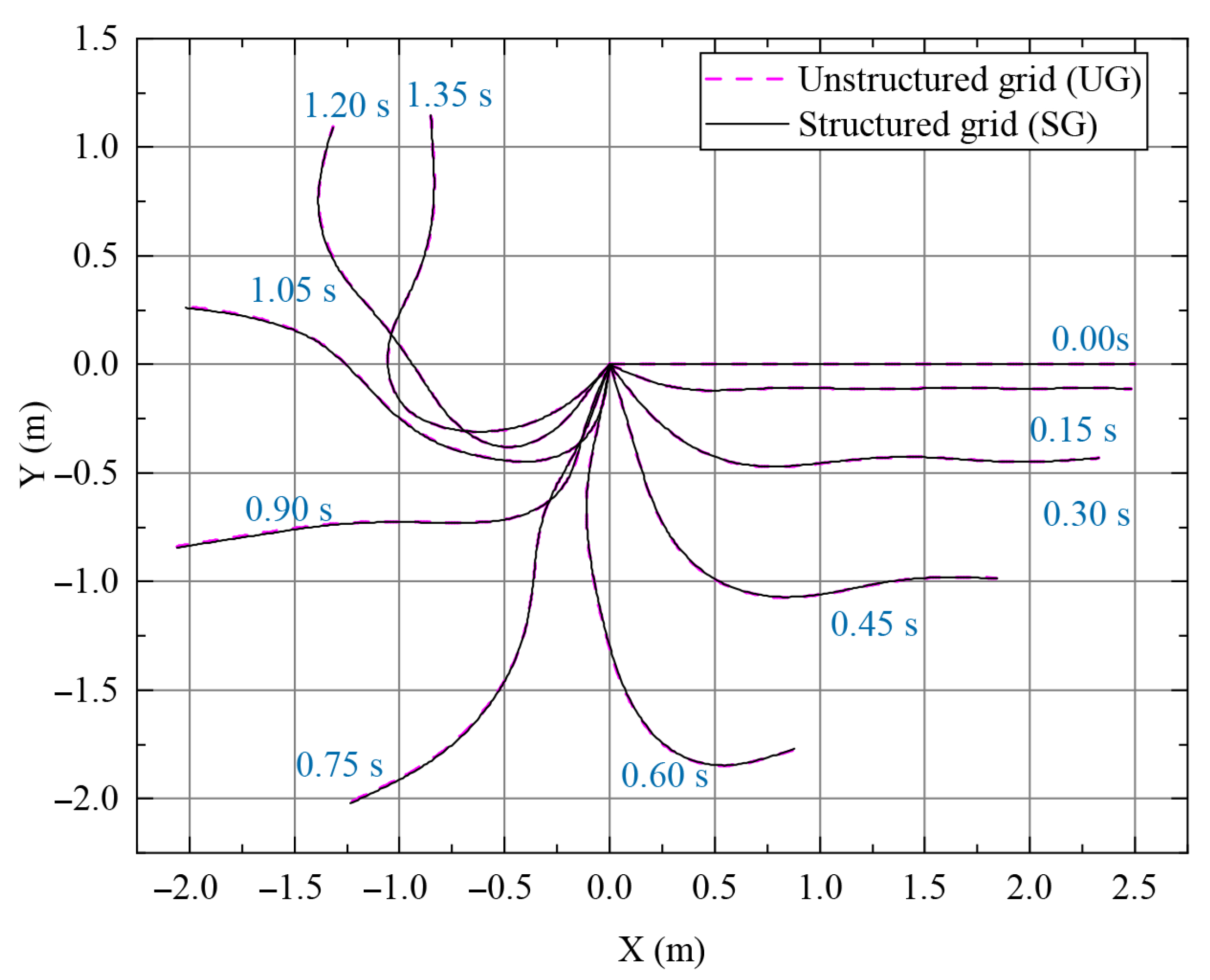 Figure 5 can be used to partition structures with different stiffness in an unstructured grid. When the time slice span is 0.15 ms, SG requires 30 SACQ elements for partitioning, while UG requires 25 elements for partitioning, and the number of elements is reduced by 18.7%. The flexible cable is initially placed horizontally and hinged with the wall at the left end. It is released at