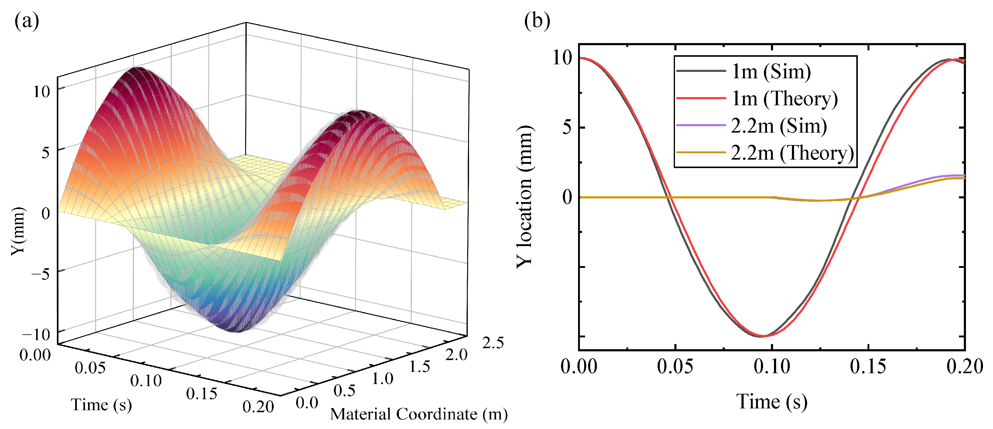 Figure 11a, the colored surface shows the deflection of the string, and the gay error bars show the error compared with the analytical solution. The deflection at 1 m and 2.2 m in 0.2 s is shown in