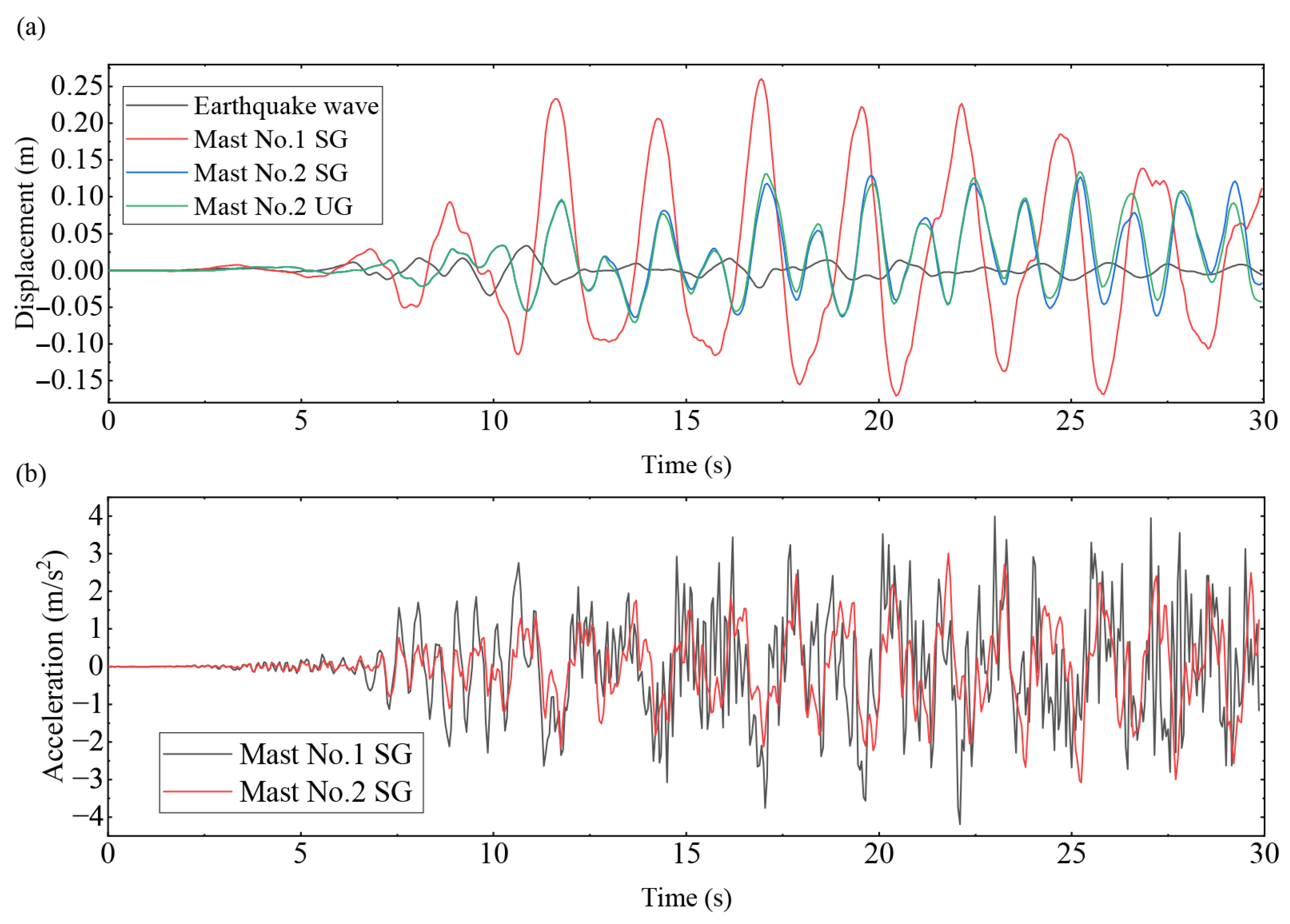 Figure 13b shows acceleration responses of the mast top; a higher acceleration peak is shown in mast No. 1 due to the higher structure stiffness, and the maximum acceleration of the structure under different stiffness is 3.99 m/