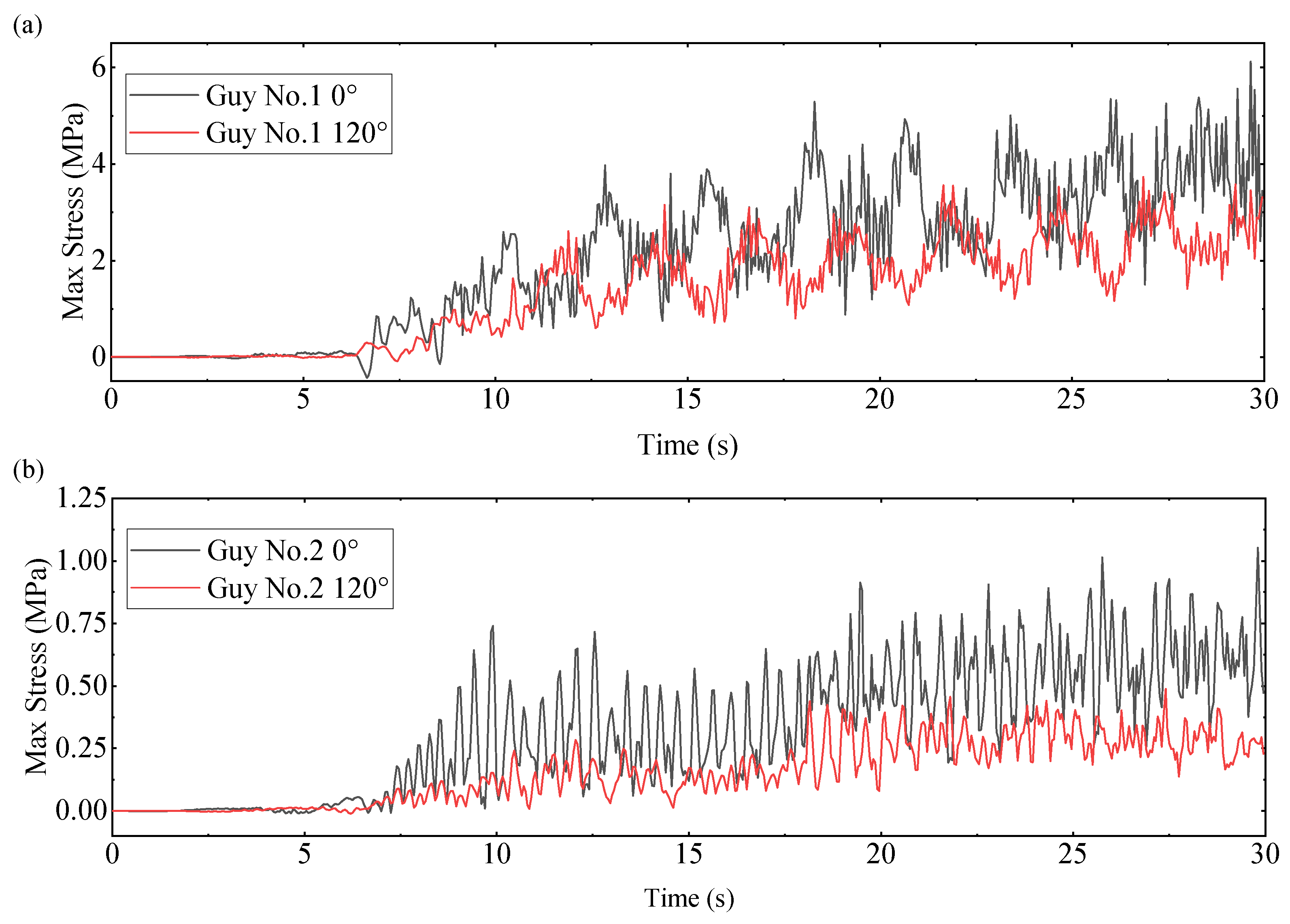 Figure 14 shows the maximum stress in the direction of the impact wave and 120° to the direction of the impact wave at material No. 1 and No. 2, respectively. The maximum stresses of No. 1 guy and No. 2 guy are 6.12 MPa and 1.05 MPa. It shows that stiffness has a great influence on the stress of the guy. The average stress of the guy in the 0° direction at different stiffnesses are all greater than the average stress in the 120° direction. In the area shown, the guy in the 0° direction is subjected to compressive stress in