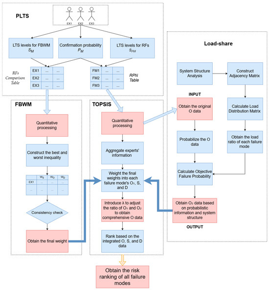 The method proposed in this paper is mainly divided into four parts. The first part is the PLTS method constructed by LTS and probability, which is used to quantify expert evaluation information. The second part is FBWM, which is applied to calculate the weights of RFs. The third part is load sharing, which deduces the probability of system failure caused by the occurrence of all fault modes based on the evaluation information of O. The fourth part is TOPSIS, which integrates the derived data into the original data for risk ranking, as specifically shown in Figure 2.
