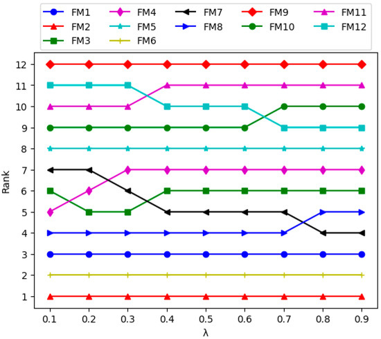 As detailed in Table 10 and visualized in Figure 5, the failure mode rankings were calculated for a spectrum of values ranging from 0.1 to 0.9. The analysis reveals that the overall risk hierarchy is notably stable. Specifically, the top two failure modes (FM2 and FM6) and the bottom one (FM9) maintain their ranks across all scenarios. This stability in the extremities of the ranking list underscores the reliability of the proposed method in identifying the most critical and least critical failure modes, regardless of the chosen balance between subjective expert opinion and objective system structure data.
