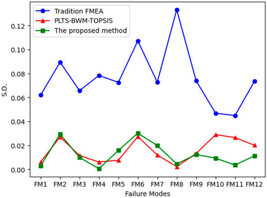 As shown in Figure 6, the analysis reveals that the standard deviations for all failure modes under the traditional FMEA method are substantially higher than those of the other two methods. This indicates that the traditional method is highly sensitive to the setting of risk factor weights; minor changes can lead to significant fluctuations in the ranking results, which is a major drawback in practical applications. In contrast, the PLTS-FBWM-TOPSIS method shows a marked reduction in standard deviation, demonstrating the enhanced stability offered by MCDM methods. Crucially, the proposed method achieves the smallest standard deviation for the majority of failure modes (e.g., FM1, FM4, FM9, FM10, FM11, and FM12). This provides strong evidence that the objective system structural information introduced by load sharing effectively counteracts the uncertainty inherent in subjective weight assignments, thereby endowing the overall risk assessment model with superior robustness.