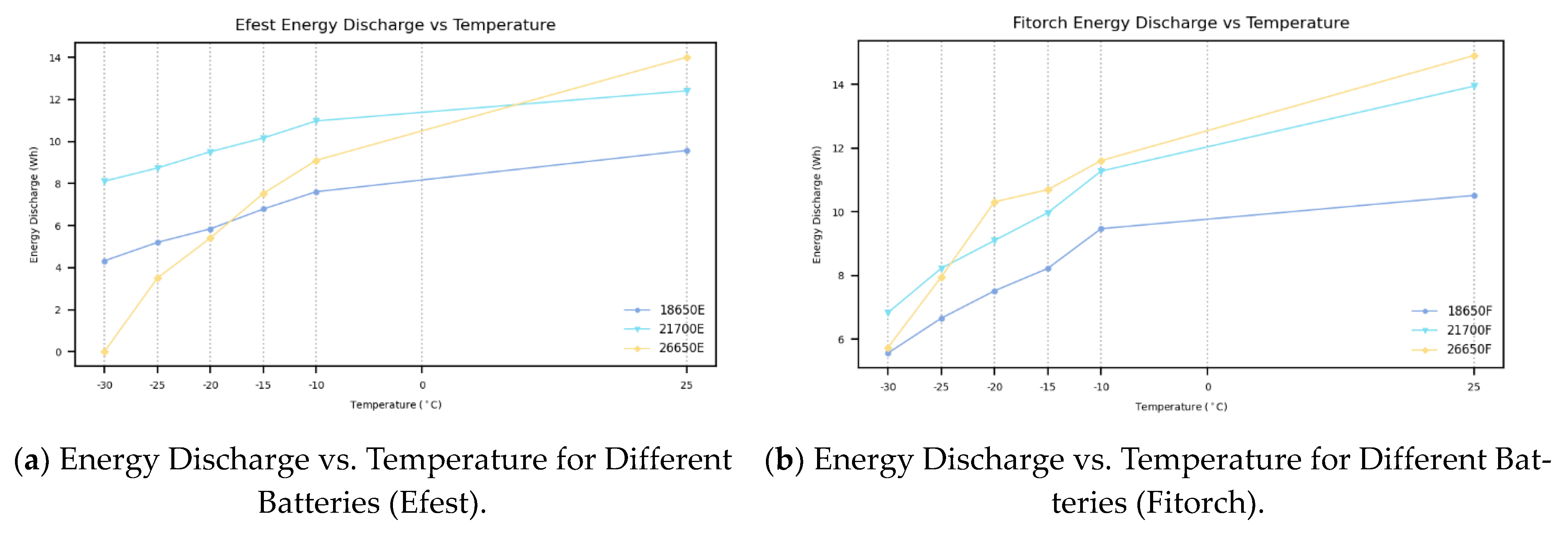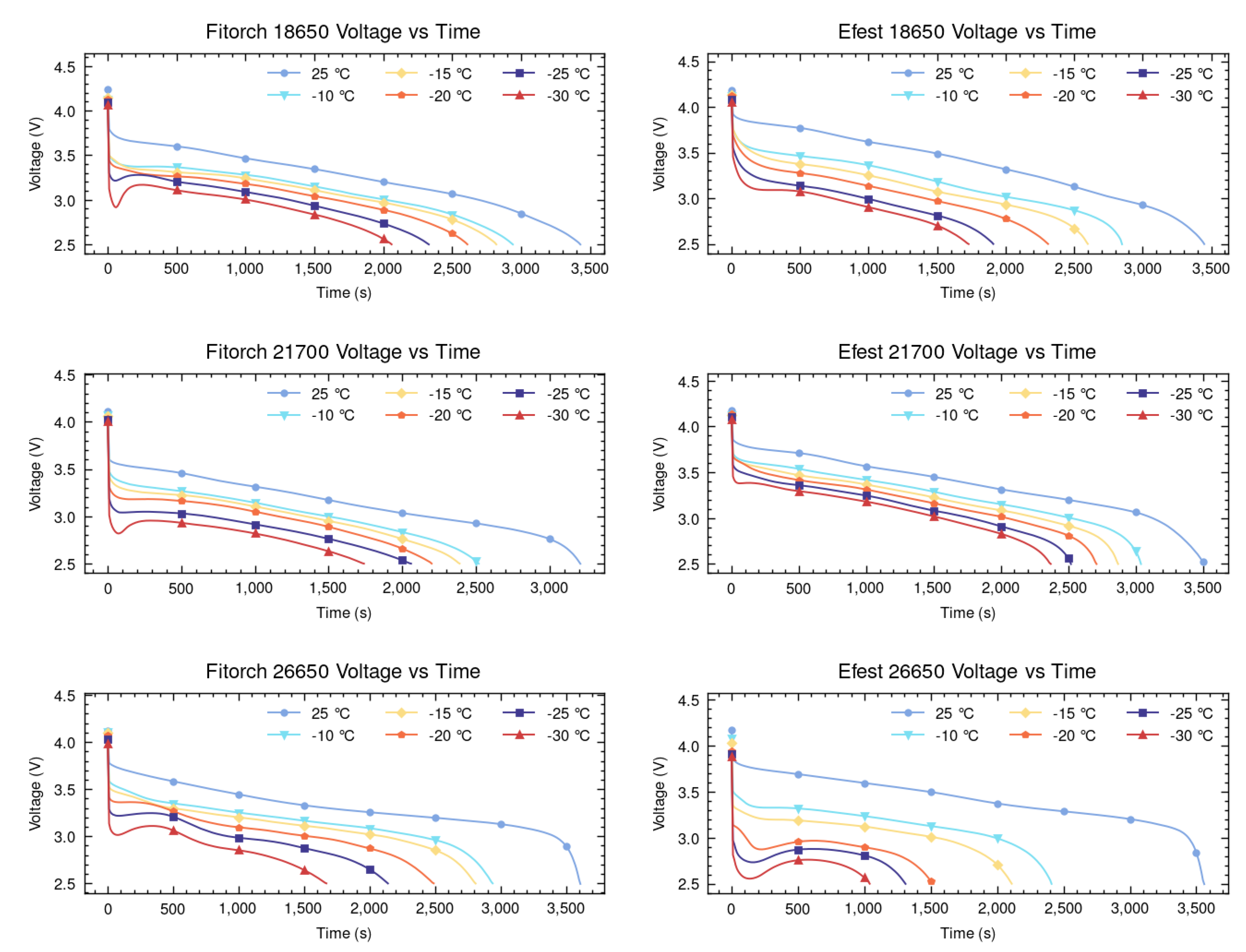 Figure 3. The figure, as well-documented in the literature, illustrates that a decrease in temperature leads to a substantial increase in voltage drop upon discharge, which consequently diminishes the operational voltage range and usable capacity. The 18650 and 21700 batteries show a similar degree of consistency in their performance across the different cold temperatures for both chemistries. Both Fitorch 18650 and Efest 18650 batteries show steady voltage at +25 °C but exhibit sharp performance declines as temperatures drop, particularly at −20 °C and −30 °C, as expected. The 21700 batteries show similar trends to the 18650 batteries but generally retain slightly better performance at lower temperatures for the Efest batteries, while falling behind moderately for the Fitorch batteries. However, both types of 26650 batteries experience the most significant reduction in the voltage range across all temperatures, with the Efest variant nearly reaching failure.