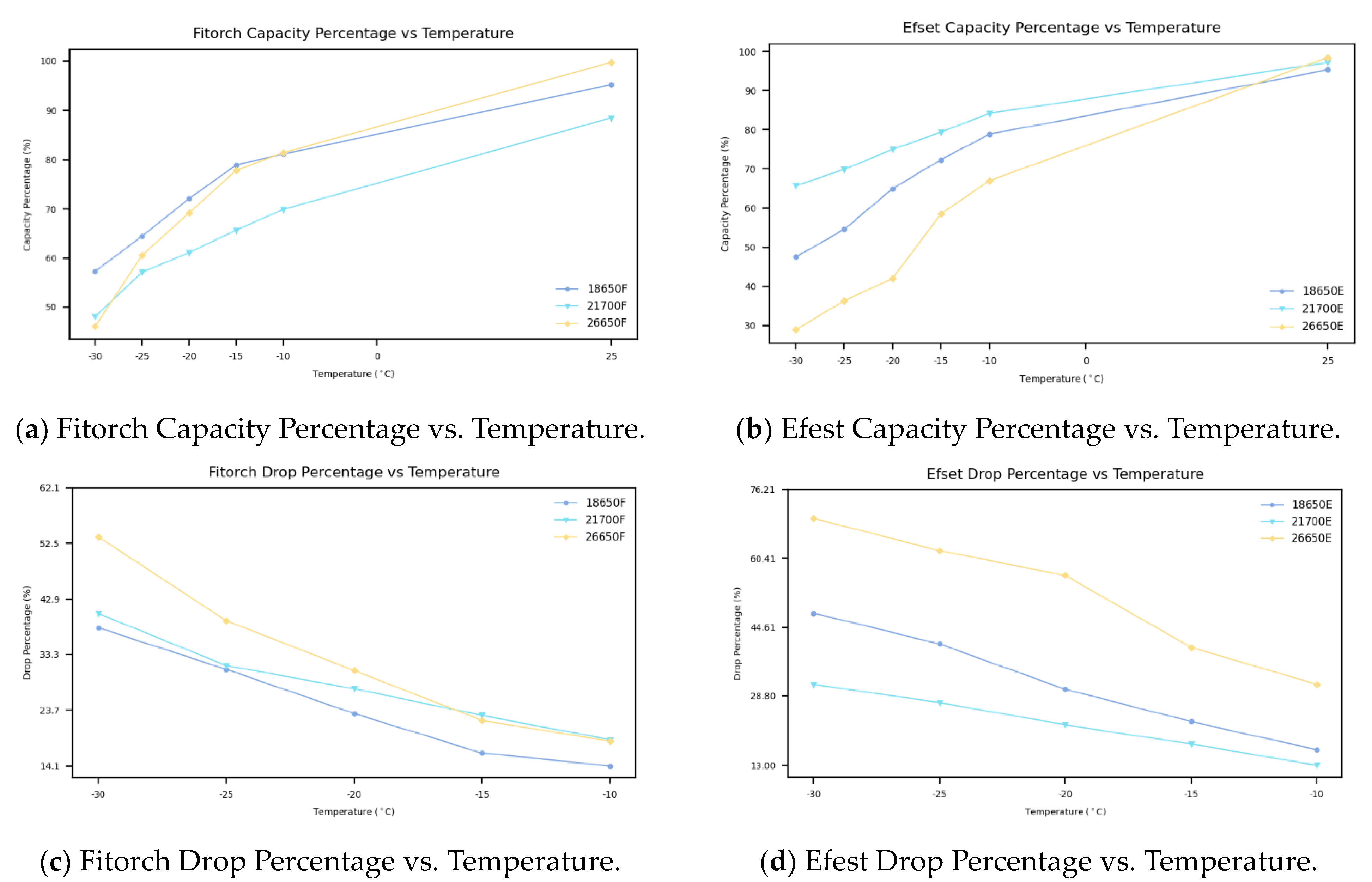 Figure 4. The capacity values were normalized as percentages based on their nominal capacities to facilitate comparison between different batteries. This conversion allows for a more straightforward comparison of capacity drops, irrespective of the varying nominal capacities of the different battery sizes. The capacity drop analysis shows that the 26650 battery experiences the highest capacity drop, with the Fitorch 26650 battery at an average drop of 32.72% and the Efest 26650 battery at an average drop of 51.96%, making it the most affected by colder temperatures. In comparison, the 18650 and 21700 batteries perform better, with a similar capacity drop between them. For the 18650 batteries, the Efest battery shows an average drop of 31.69%, while the Fitorch battery shows an average drop of 24.44%. The Efest 21700 battery exhibits an average drop of 22.36%, while the Fitorch 21700 battery exhibits an average drop of 28.11%. The aforementioned analysis demonstrates that capacity declines vary between chemistries, even among batteries of identical size; this variation suggests that cold temperatures exert distinct impacts on each battery chemistry within the same-size classification.