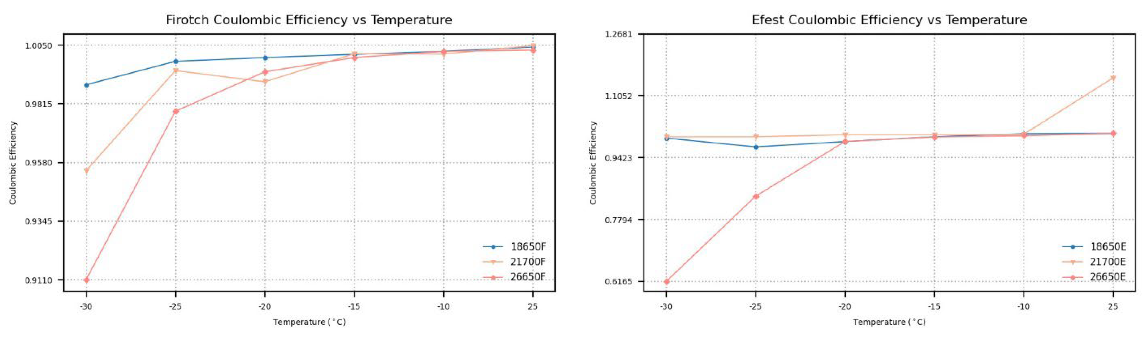 Figure 6). The 21700 batteries maintain an efficiency close to unity, suggesting resilient performance over diverse temperature ranges. Notably, the CE should not surpass unity, yet a slight margin of error is present, likely attributable to the manual soldering process when affixing the batteries to the wires connected to the UBA5.