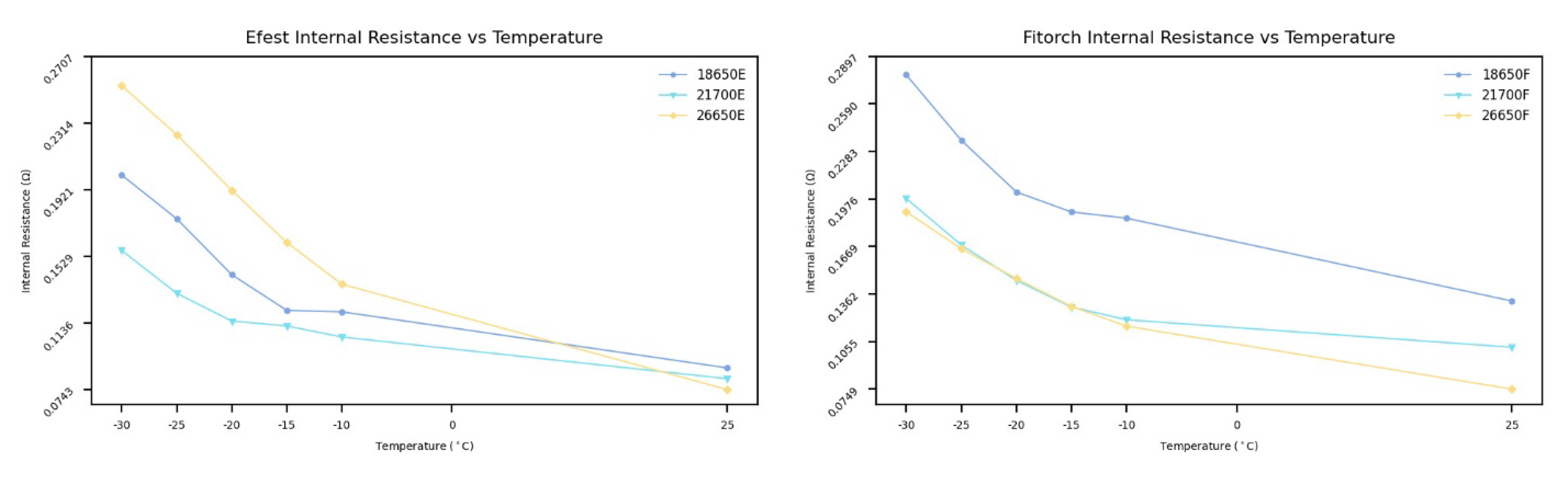 Temperature dependence further highlights these differences. Across all tested cells, internal resistance increased markedly as temperature decreased. When cooled from 25 °C to –10 °C, resistance typically increased by 35–50%, and by 80–120% at –20 °C. At –30 °C, the increase exceeded 150% for certain cells, indicating severe kinetic limitations at deep sub-zero temperatures. The Fitorch 21700 cell showed the largest temperature-driven increase, while the Efest 21700 cell exhibited the smallest, underscoring the combined influence of chemistry, electrode structure, and manufacturing design on low-temperature performance.