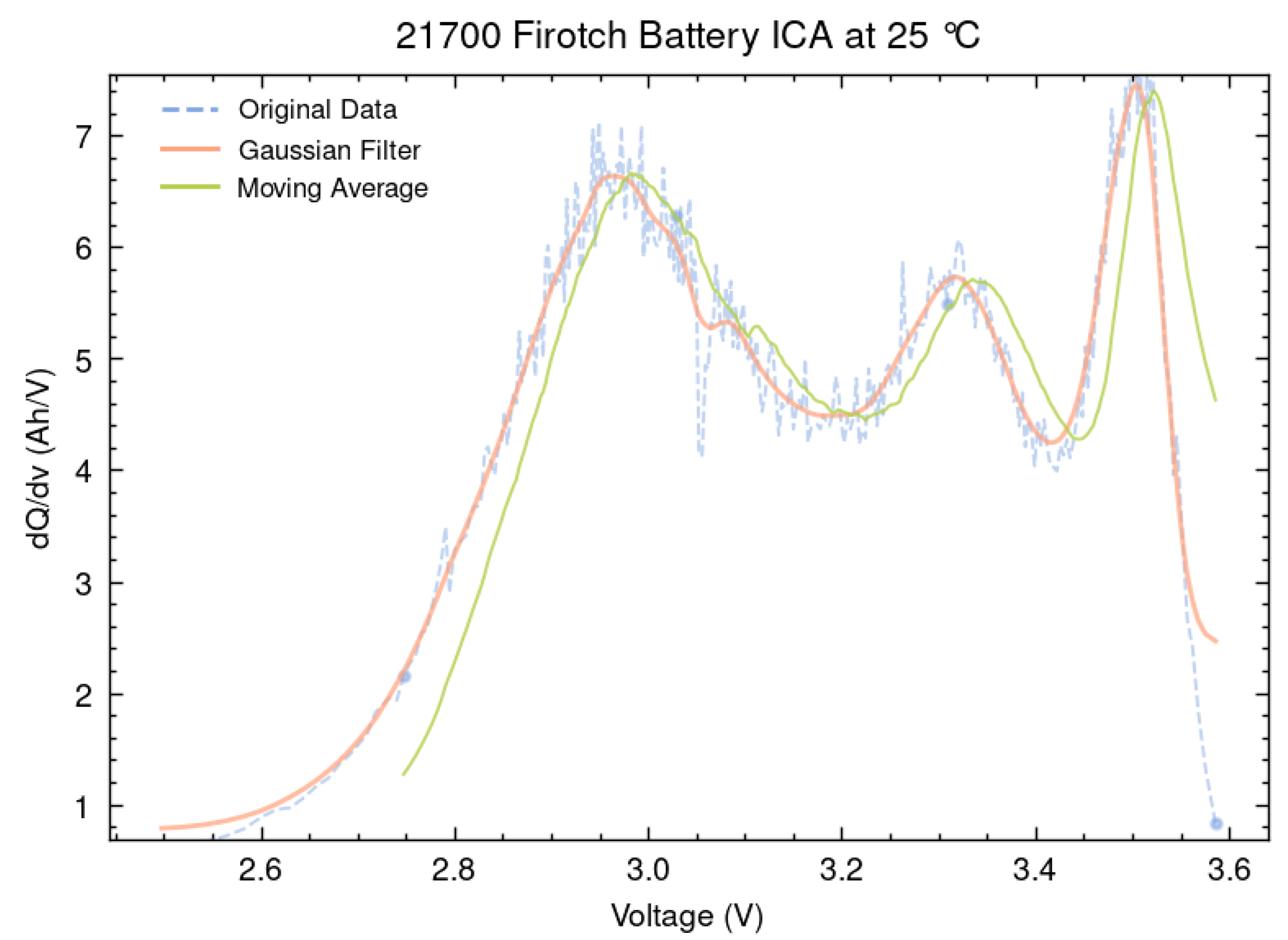 During ICA at low temperatures, we identified a critical observation regarding the limitations of Gaussian filtering. While Gaussian filtering is commonly used to smooth noisy data, it tends to overly smooth important peaks in the ICA curves under challenging conditions, such as low temperatures. The Gaussian filter applies a uniform smoothing across all data points, thereby neglecting the need for varying levels of sensitivity in different regions of the curve. These peaks are crucial for identifying early degradation indicators and understanding long-term battery performance. Over-smoothing these features can obscure significant details and hinder accurate analysis.