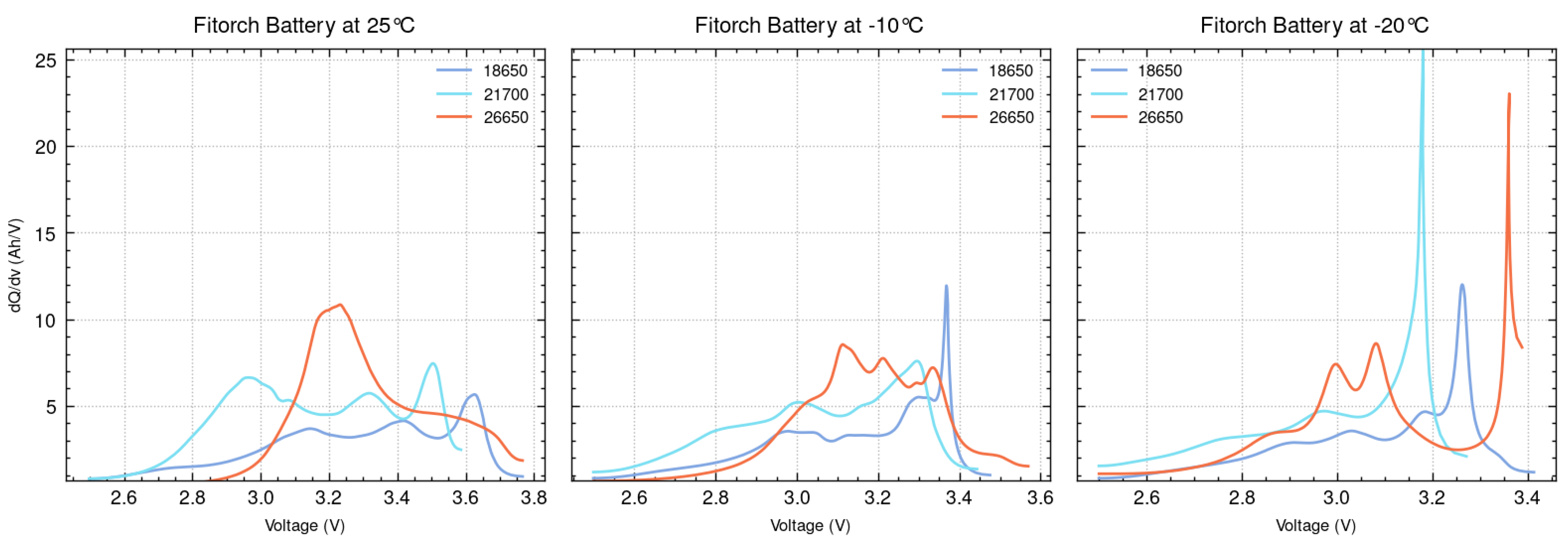 ICA is conducted for the 18650, 21700, and 26650 batteries across various temperatures. To demonstrate the overall trend, results at three representative temperatures (+25 °C, −10 °C, and −20 °C) are selected for detailed analysis and are presented in