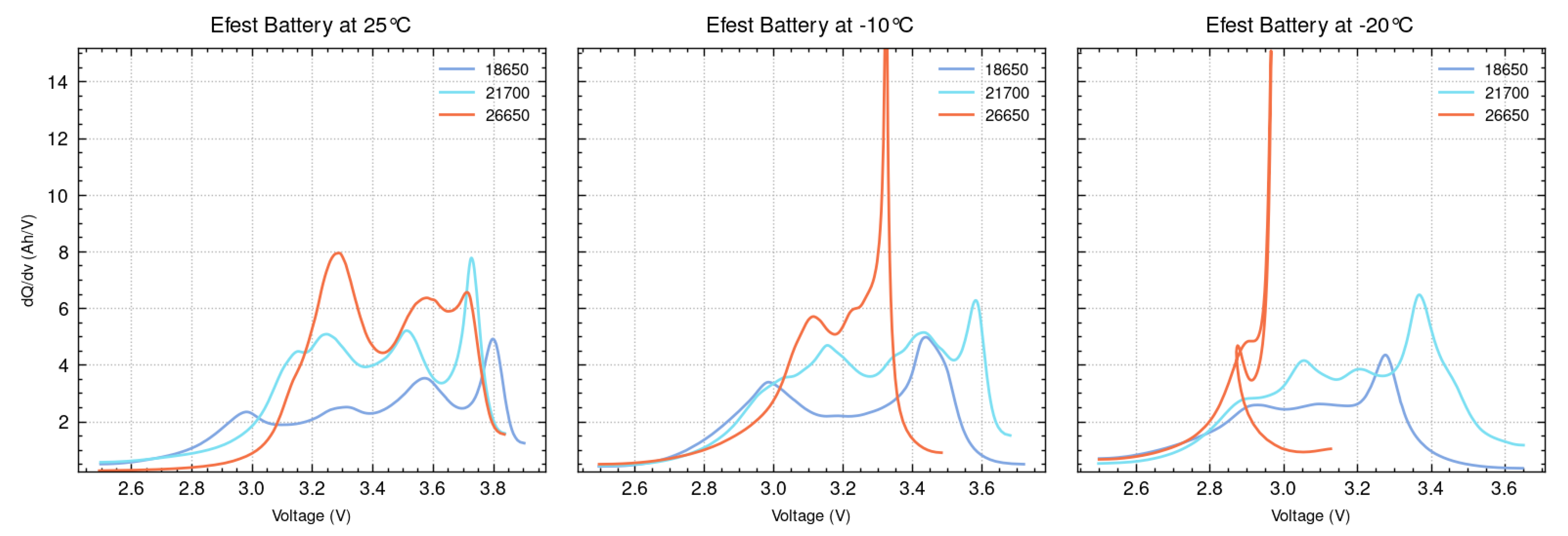 Figure 10. Comparing the ICA plots at these temperatures, all three battery types exhibit noticeable shifts in their peaks, highlighting the influence of temperature on their electrochemical behavior and overall performance. These peak shifts typically occur at lower voltages compared to the +25 °C case, indicating that the voltage at which certain electrochemical processes occur is lower at colder temperatures. This behavior is attributed to the significant impact of lower temperatures on the kinetics of lithium-ion intercalation and de-intercalation, which result in increased internal resistance, slower reaction rates, altered phase transitions, and diminished electrochemical activity.