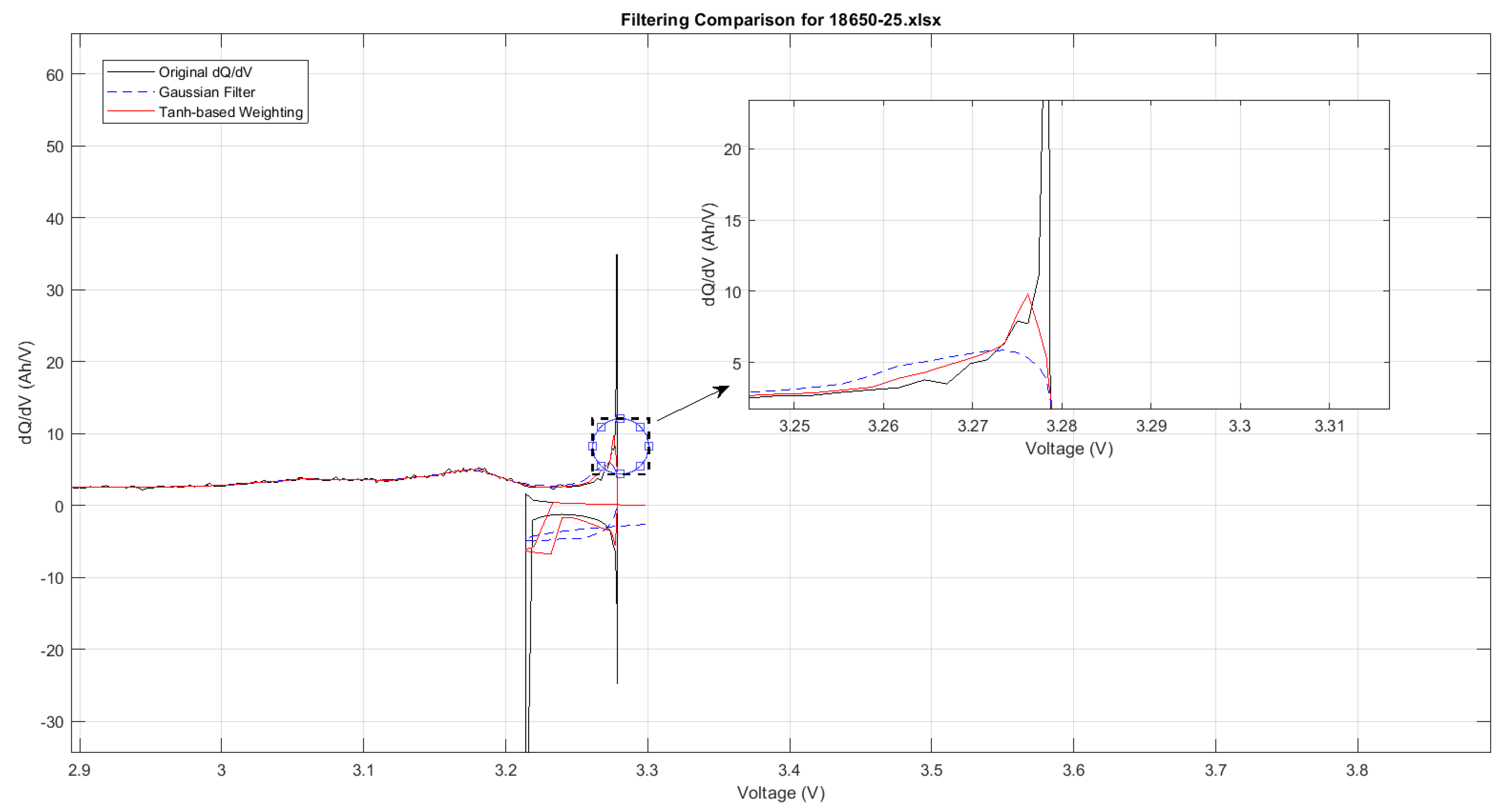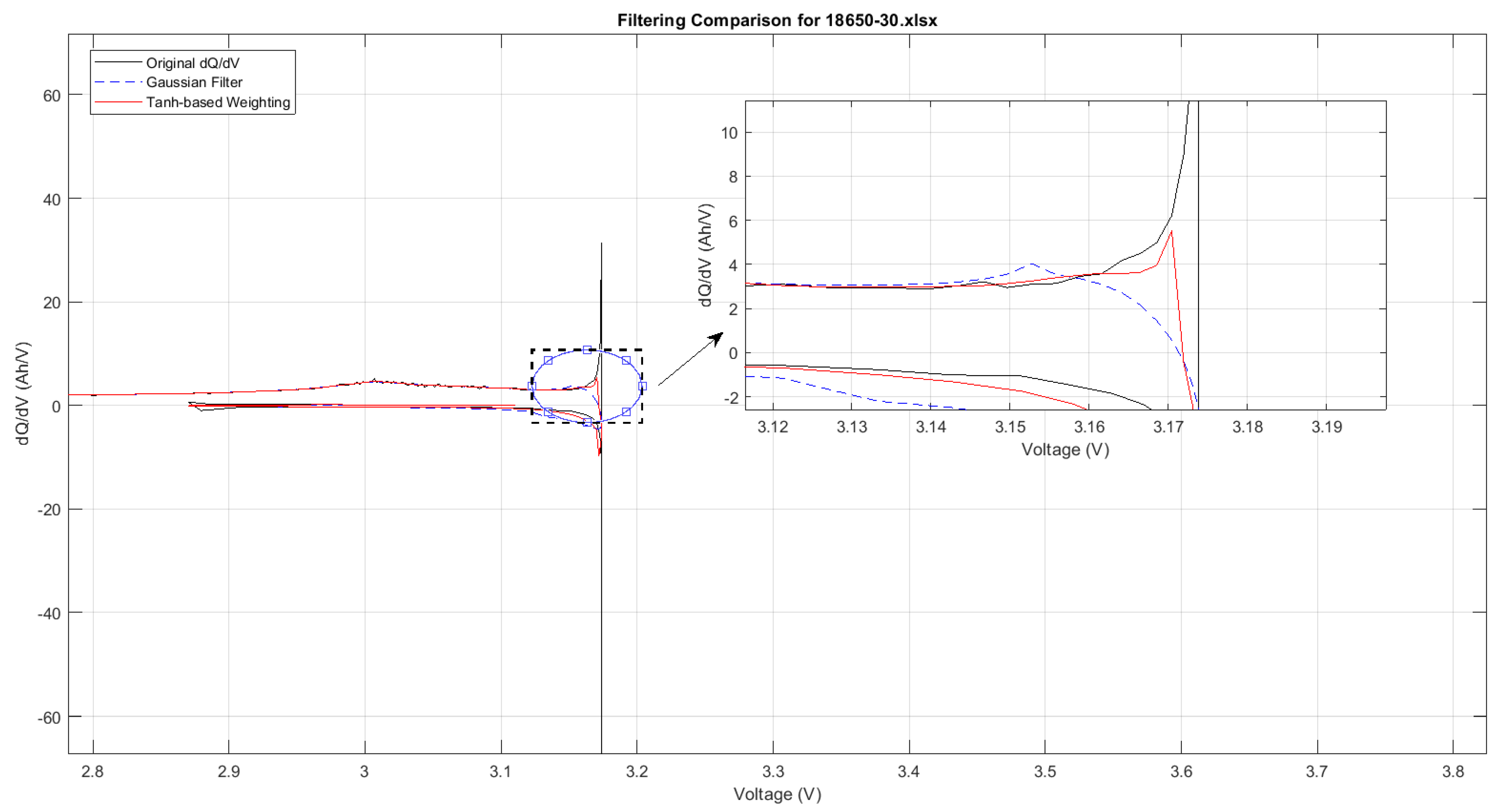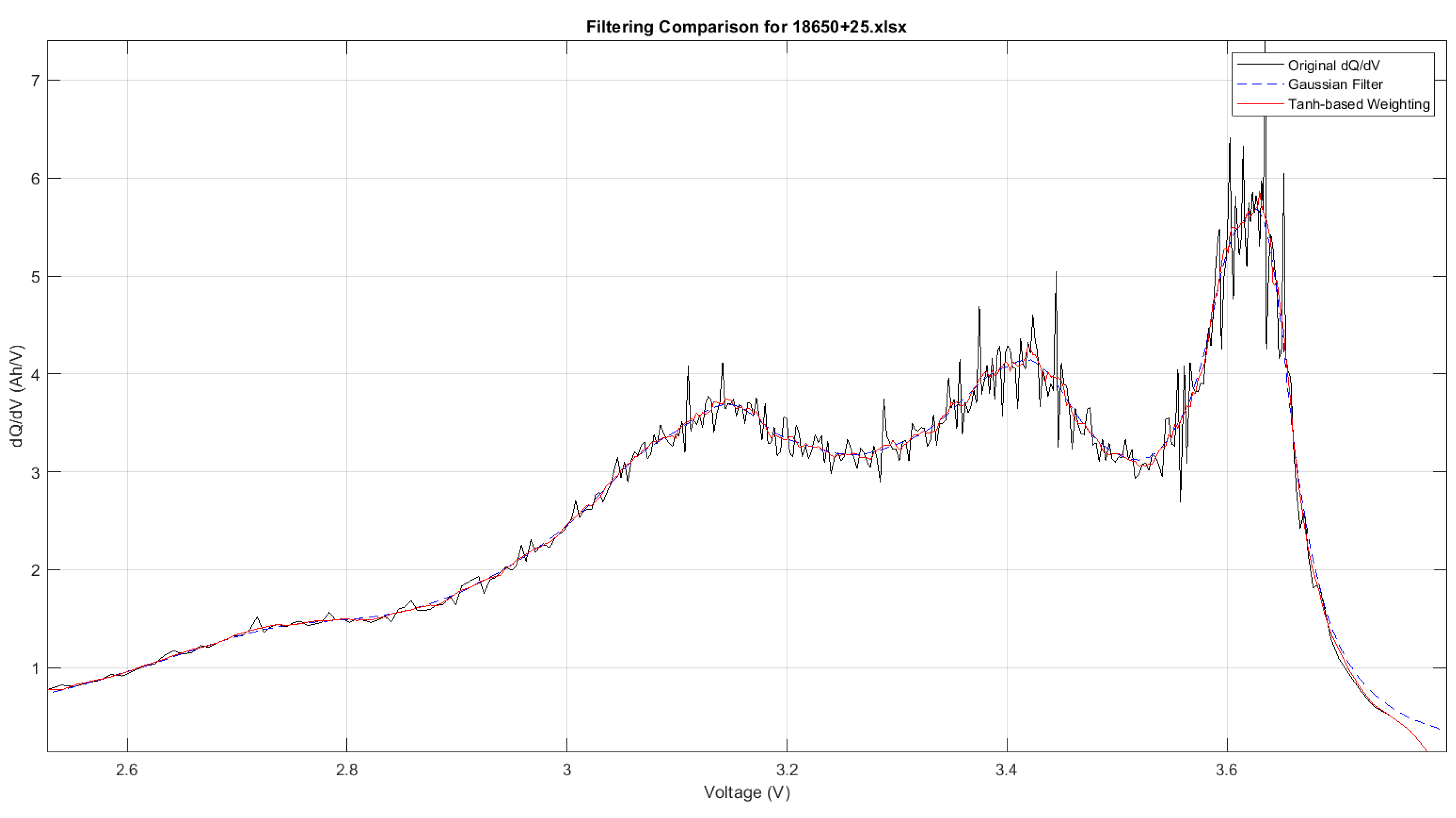 Despite the superior performance of the Gaussian filter compared to the moving average filter, the Gaussian filter has several disadvantages; for example, it tends to over-smooth critical peaks, thereby obscuring key feature distinctions. To remedy this, in the next section, a novel hybrid filtering technique is introduced that amalgamates the advantages of various approaches to overcome these issues and enhance peak detection fidelity. In ICA, precision in peak detection is imperative for discerning nuanced variations in battery performance, such as changes in internal resistance, degradation patterns, and capacity loss over time. Accurately identified peaks yield vital information regarding the battery’s electrochemical dynamics, thereby facilitating more precise diagnostics, refined SOH evaluations, and the formulation of charging strategies that adeptly correspond to the battery’s current state [