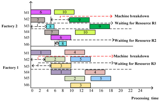 In Figure 1, the sequence {J1, J2, J3, J4, J5, J6, J7, J8, J9, J10} signifies the order in which jobs are introduced into the factory for processing. Obviously, J8 completes its initial processing stage by time 6, but the second stage of processing was not started until time 7. This delay is attributed to machine 4 and machine 5 in the second stage of factory 2 requiring one unit of resource R3 for processing. As a result, the operation of machine 6 must wait for the completion of the processing of machine 4 and the release of 1 unit of resource R3 before J8 can proceed. Furthermore, J9 should be processed at time 5. However, a machine breakdown occurred at that moment, impeding processing until the machine underwent repair. Consequently, the processing of J9 could only commence at time 9. The discrepancy of 4 time units between these instances corresponds to the duration of the machine breakdown.