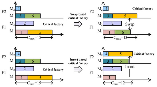 To prove the correctness of the lemma, assuming that the completion time of the non-critical factory is reduced, it can be seen through Equation (42) that the total completion time is related to the factory with the maximum completion time, which is called the critical factory. Therefore, Cmax must be unchanged. If Equation (42) demonstrates a reduction in the total completion time, it implies that the completion time of the critical factory must also be decreased.