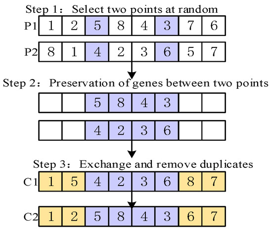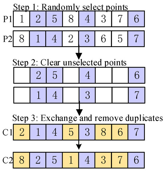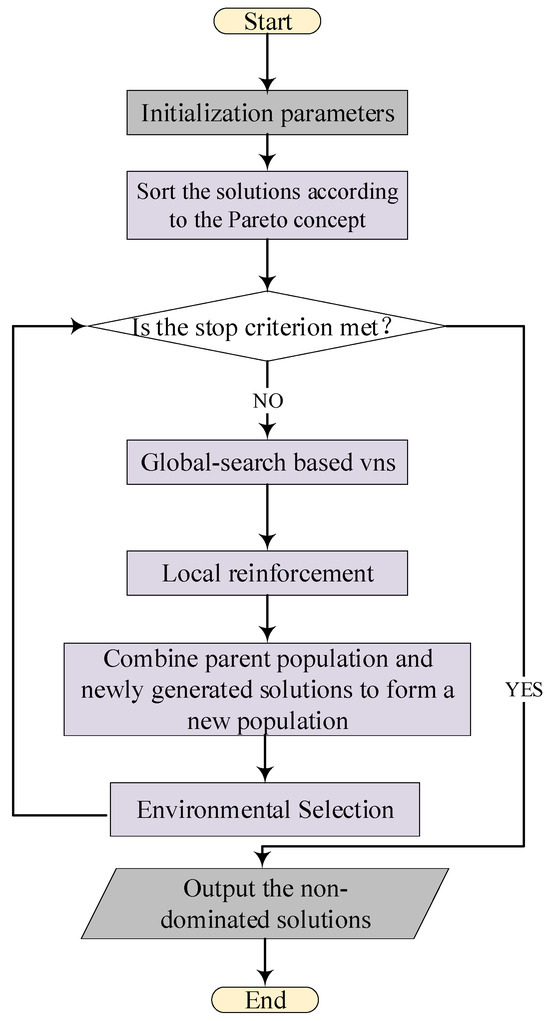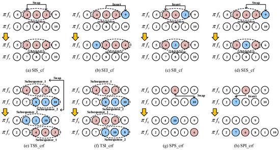 The primary structure of the BNMOEA outlined in Figure 3 is derived from the AGEMOEAII algorithm, which is itself grounded in the Pareto frontier and is known for its strong convergence and diversity characteristics. The differences between BNMOEA and AGEMOEAII are as follows: (1) Replace the original initialization method with a hybrid initialization method. (2) Replace order crossover with three crossover operators. (3) To further enhance the local search capability, a variable neighborhood search strategy is introduced, which is centered around critical factories.