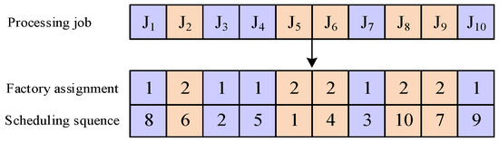 Within the algorithm under consideration, a two-dimensional vector is used to represent each solution. The vector in the first dimension pertains to factory assignment, which guarantees that each job will be assigned to a factory. The number of jobs determines the length of the first-dimension vector. The second dimension is named the scheduling vector , which means that the sequence of job processing can be determined through the second dimension. The number of jobs also determines the length of the second-dimension vector.