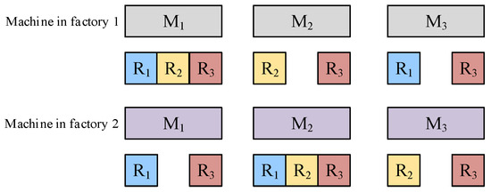 The different colors indicate that the jobs are allocated to different factories, namely, J1, J3, J4, J7 and J10, are processed in the first factory, whereas J2, J5, J6, J8 and J9 are assigned to the second factory. The encoding representation also specifies the scheduling sequence of each job within each factory. The scheduling sequence obtained in Figure 4 is the overall scheduling sequence, i.e., the jobs are in the scheduling sequence of both tasks. For example, for factory 1, J1, J3, J4, J7 and J10 are assigned, and the resulting scheduling sequence is then rearranged in ascending order to obtain a new processing order, which means {J3, J7, J4, J1, J10}. The processing time of the job is randomly generated as an integer unit of time from 50 to 100. For instance, J1 has an associated processing time of 55, J7 has an associated processing time of 61, and the processing time of J10 is 69. For resource constraints, the different colors of the machines represent the different factories in which they are located and each machine has different resources to match. As shown in Figure 5, machine 1 would require R1, R2, and R3 in factory 1, whereas machine 1 would require R1 and R3 in factory 2 and R2 is not required in factory 2. In other words, even the same machine has different dependencies on resources.