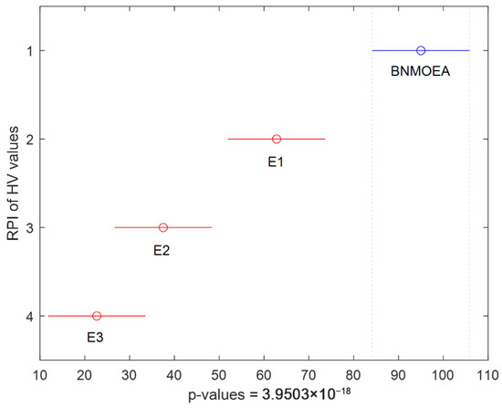 Kruskal–Wallis’s comparisons for BNMOEA, AGEMOEAII, BiGE, CMOPSO, and NSGAII (HV values).
