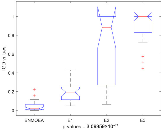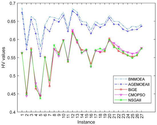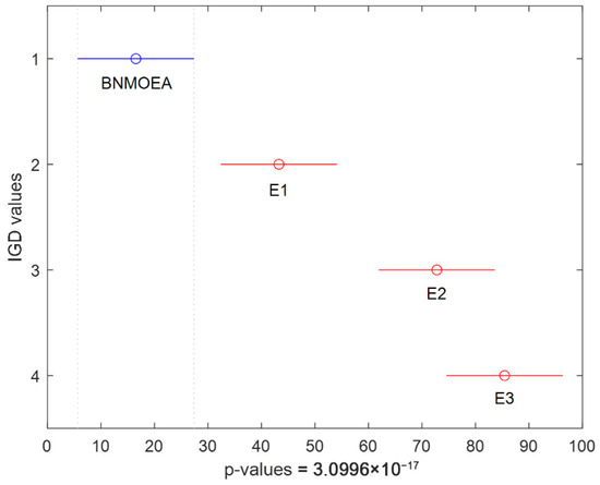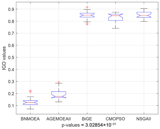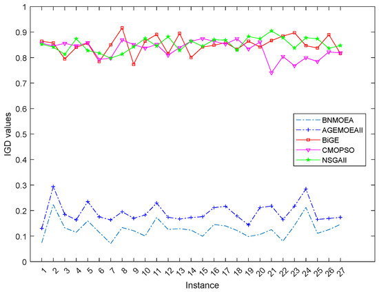 Figure 16 illustrates the Kruskal–Wallis comparisons for HV values among the five comparison algorithms, while Figure 17 reports the trend of HV values with increasing instances scale. The two figures verify the efficiency of the proposed algorithm considering the HV indicator. Figure 18 illustrates the Kruskal–Wallis comparisons for the BNMOEA, AGEMOEAII, BiGE, CMOPSO, and NSGAII considering the IGD values, while the trend of IGD values with increasing scale was reported in Figure 19. The two figures also verify the effectiveness of the proposed algorithm considering the IGD indicator.