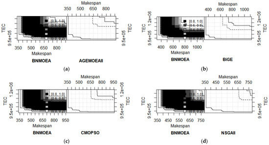 In addition, we have tested the above comparison algorithms using the Empirical Achievement Function (EAF) [65]. In the EAF, the color indicates the difference in the probability of this algorithm dominating the corresponding solution compared with another algorithm. The higher the difference, the darker the color, and the higher the probability that the result obtained here will dominate the solution compared with another algorithm. In short, the darker the color and the larger the area, the better the algorithm. The following conclusions can be obtained from Figure 20: (1) The shaded portion of the BNMOEA is larger than the other comparison algorithms, which proves that the BNMOEA has a better performance. (2) The BNMOEA also outperforms the other four comparative algorithms under different scheduling environments. Therefore, the EAF demonstrates that the BNMOEA has an excellent performance.