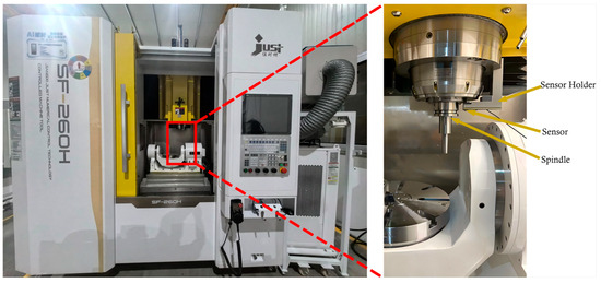 The motorized spindle axial thermal elongation measurement device utilizes an eddy current displacement sensor. An eddy current displacement sensor is commonly employed for measuring minute surface displacements of metallic materials. It typically comprises a power supply, coil, and sensing probe. When energized, the coil generates a high-frequency alternating electromagnetic field that penetrates the surface of the measured metal, inducing eddy currents. Displacement of the target object alters the eddy current induction characteristics, thereby modifying the electromagnetic field properties. The sensing probe detects this variation, determining displacement magnitude through electromagnetic field measurements. Eddy current displacement sensors exhibit high sensitivity, non-contact measurement capability, high precision, and good stability. The eddy current displacement sensor was calibrated prior to the experiments using a high-precision laser interferometer to ensure measurement accuracy. The physical configuration of the measurement setup is illustrated in Figure 2. 5-axis vertical machining center used in this experiment, model SF260H, manufactured by Jiangxi JUST Numerical Control Co., Ltd. (Nanchang, China). Specifications include a 260 mm diameter rotary table, and XYZ axis travel ranges of 700 mm, 500 mm, and 360 mm, respectively, with repetitive positioning accuracy of less than 1 μm.