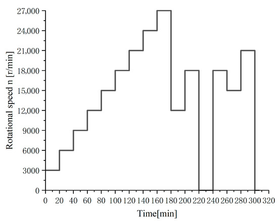 As discernible from Figure 3, the spindle speed design comprises three phases. In the first phase, the rotational speed progressively increases from an initial 3000 r/min, rising by 3000 r/min per 20-min interval until reaching 27,000 r/min. The second phase involves two abrupt speed reduction processes: the first plummets from 27,000 r/min to 12,000 r/min, and the second drops directly from 18,000 r/min to 0 r/min. The third phase is designed as a fluctuating speed working condition, exhibiting acceleration followed by deceleration and re-acceleration.