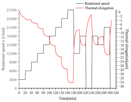 Thermal elongation measurements obtained via eddy current displacement sensors under the designed speed conditions are shown in Figure 4. Note: Negative values indicate downward thermal elongation.