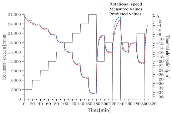 The cumulative thermal elongation prediction model was fitted using the test data from multiple variable-speed operating conditions in Figure 4, and the results are shown in Figure 5.