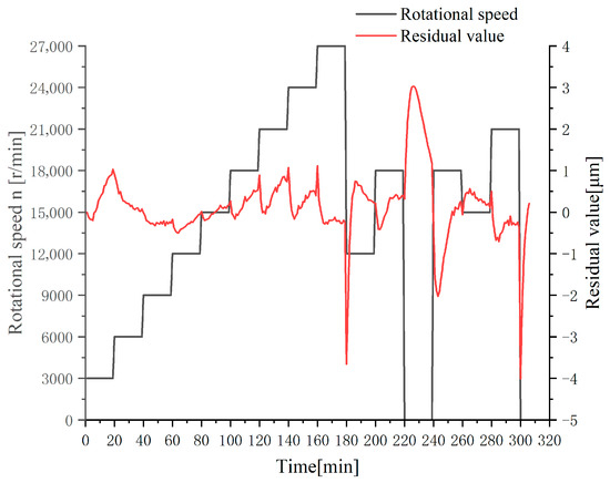 In the validation experiments, the cumulative thermal error compensation model demonstrated satisfactory prediction performance, as shown in Figure 8. During the initial minutes after spindle start-up, the residual values exhibited significant fluctuations. After the rotational speed stabilized, the residuals converged to values around zero. During abrupt speed-increase transitions, a discrepancy of 1.28 μm was observed between predicted and experimentally measured values. The maximum residual value recorded during the experiments was 2.04 μm. The thermal compensation model established based on rotational speed and cumulative thermal error exhibits strong universality, being applicable to various variable-speed operating conditions while also delivering significant compensation effectiveness. During detected speed transients, the compensation update cycle could be intelligently lengthened to effectively filter these short-term prediction peaks, prioritizing stability over instantaneous response.