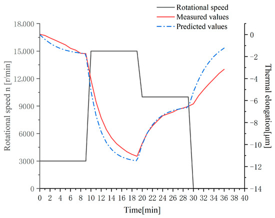 An experiment with spindle rotational speed varying in the range of 3000–15,000–10,000 r/min was designed, with data collected at 1-min intervals. The measured spindle thermal elongation data and model validation results are presented in Figure 6. The prediction performance evaluation of the model is shown in Figure 7.