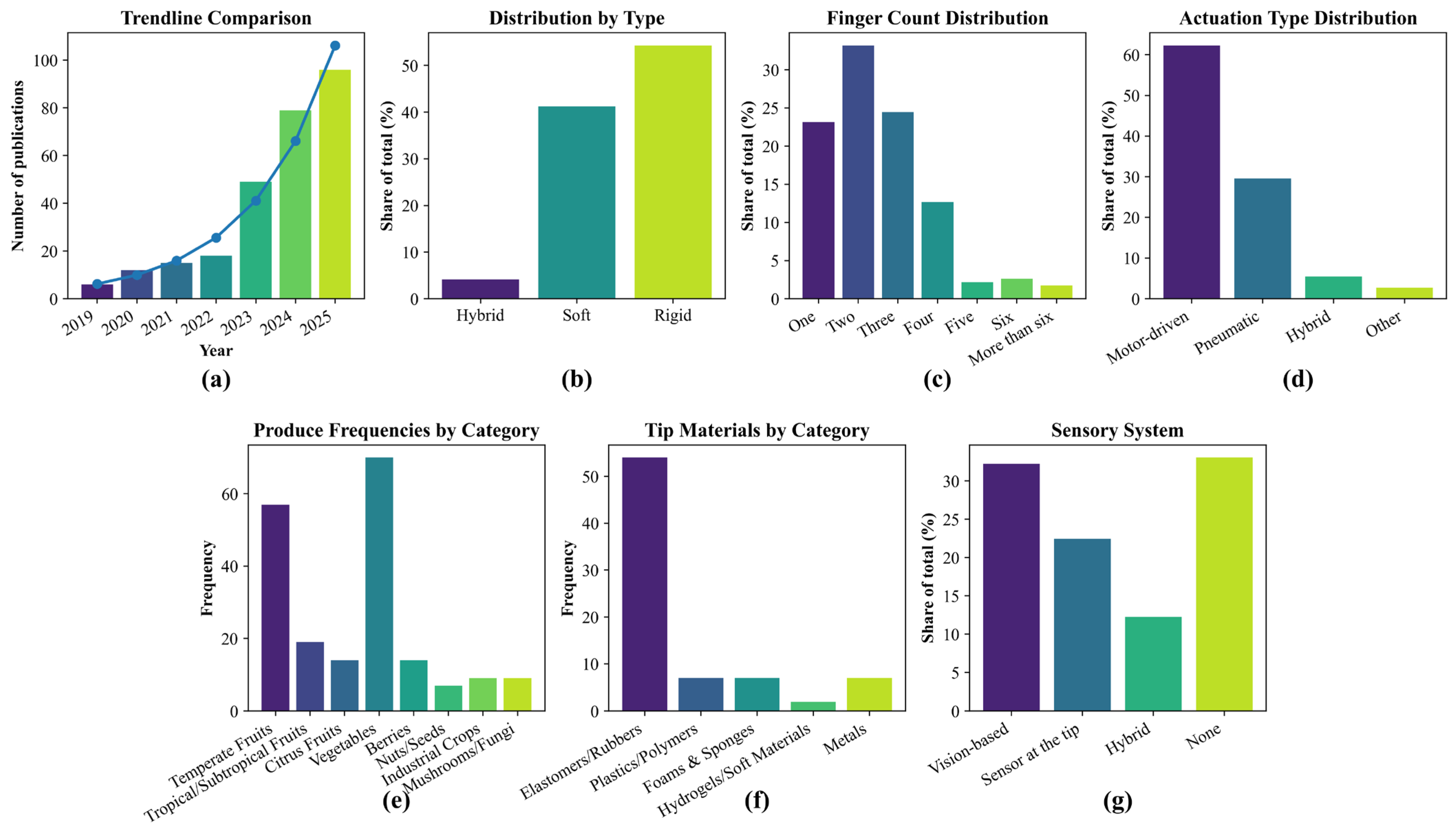 - Sensor at the tip: Designs that employ various types of sensors at the contact interface of the gripper or end-effector to protect the produce. These include photoelectric/photonic, pressure/force, triboelectric, piezoelectric, PVDF, magnetic/electromagnetic, capacitive, ultrasonic sensors, etc.