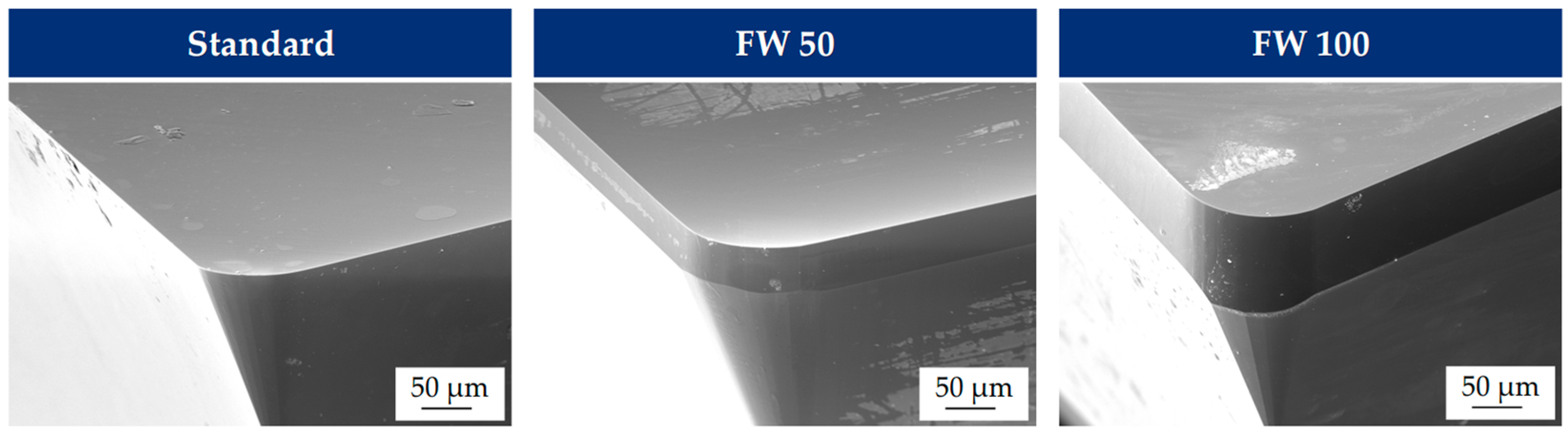 Generally, using the tools with a flank wear land width of 100 µm leads to reduced surface roughness values compared to machining with indexable inserts characterized by a flank wear land width of 50 µm. This is explained by the smoothing effect of the artificially generated flank wear land.
