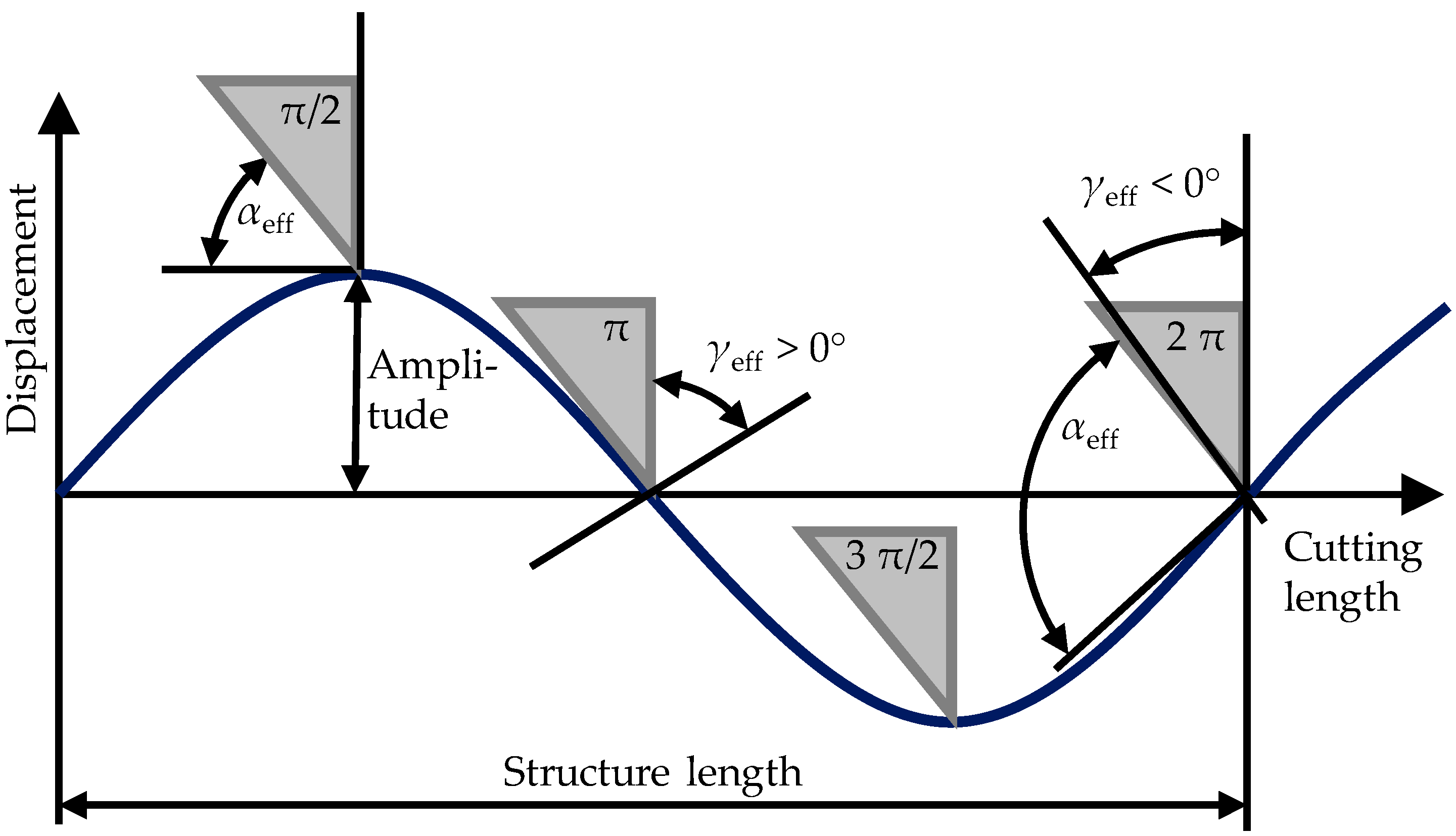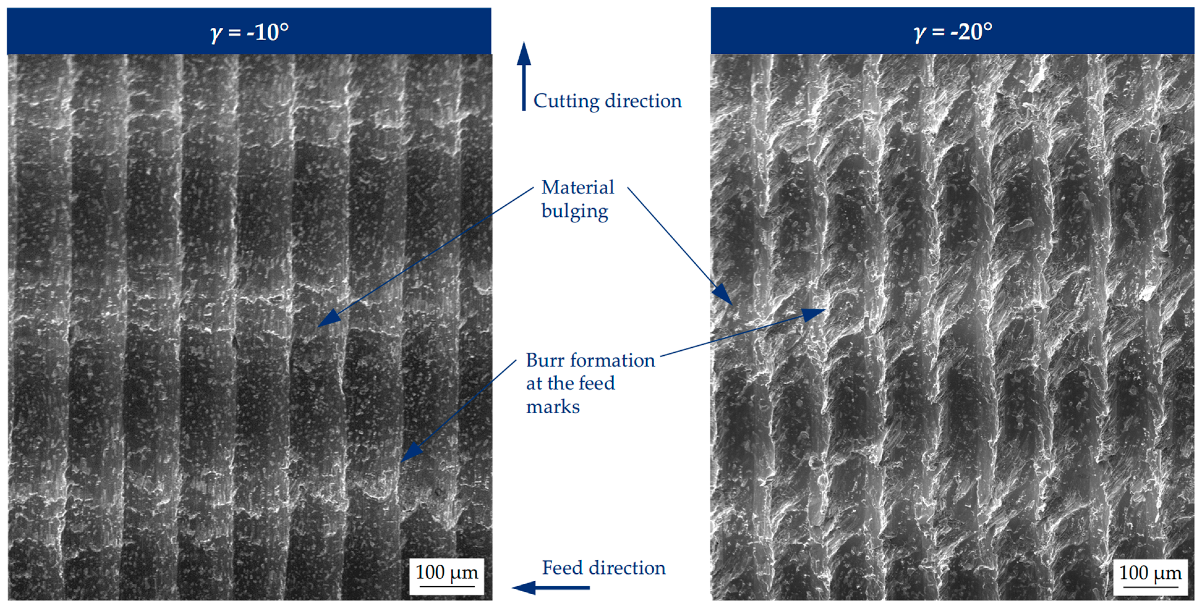 22]. The changing forces and resulting changing stresses explain the mentioned variations in the surface properties depending on the nominal and effective rake angle.