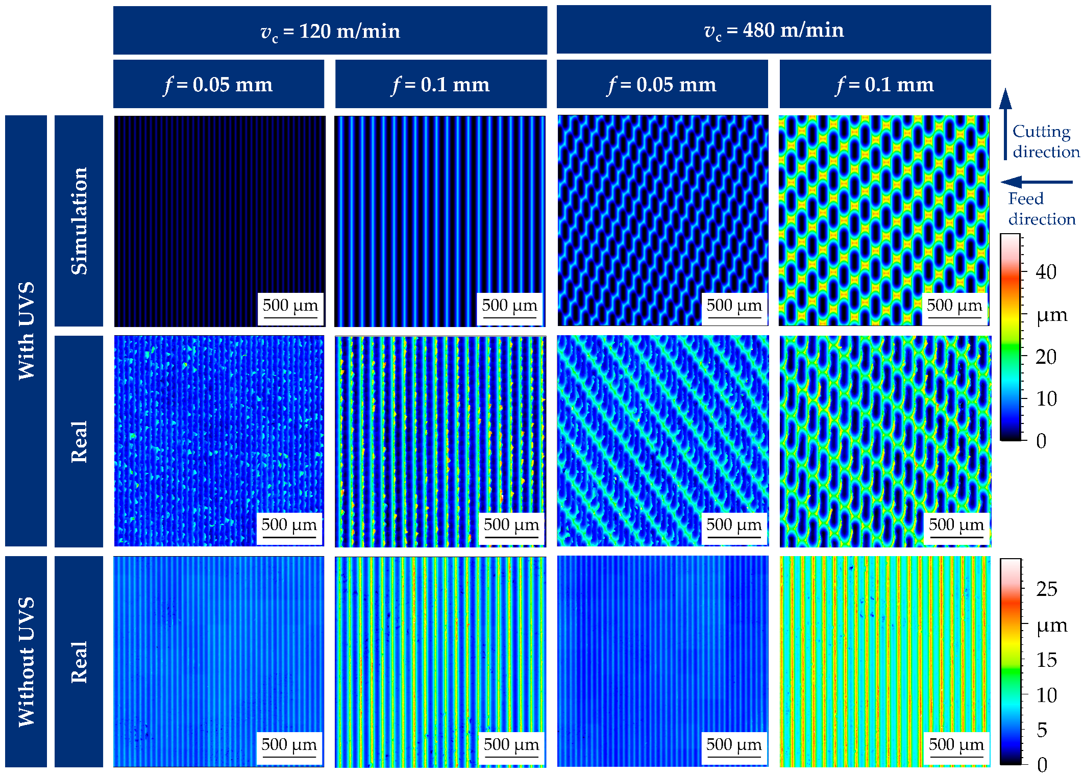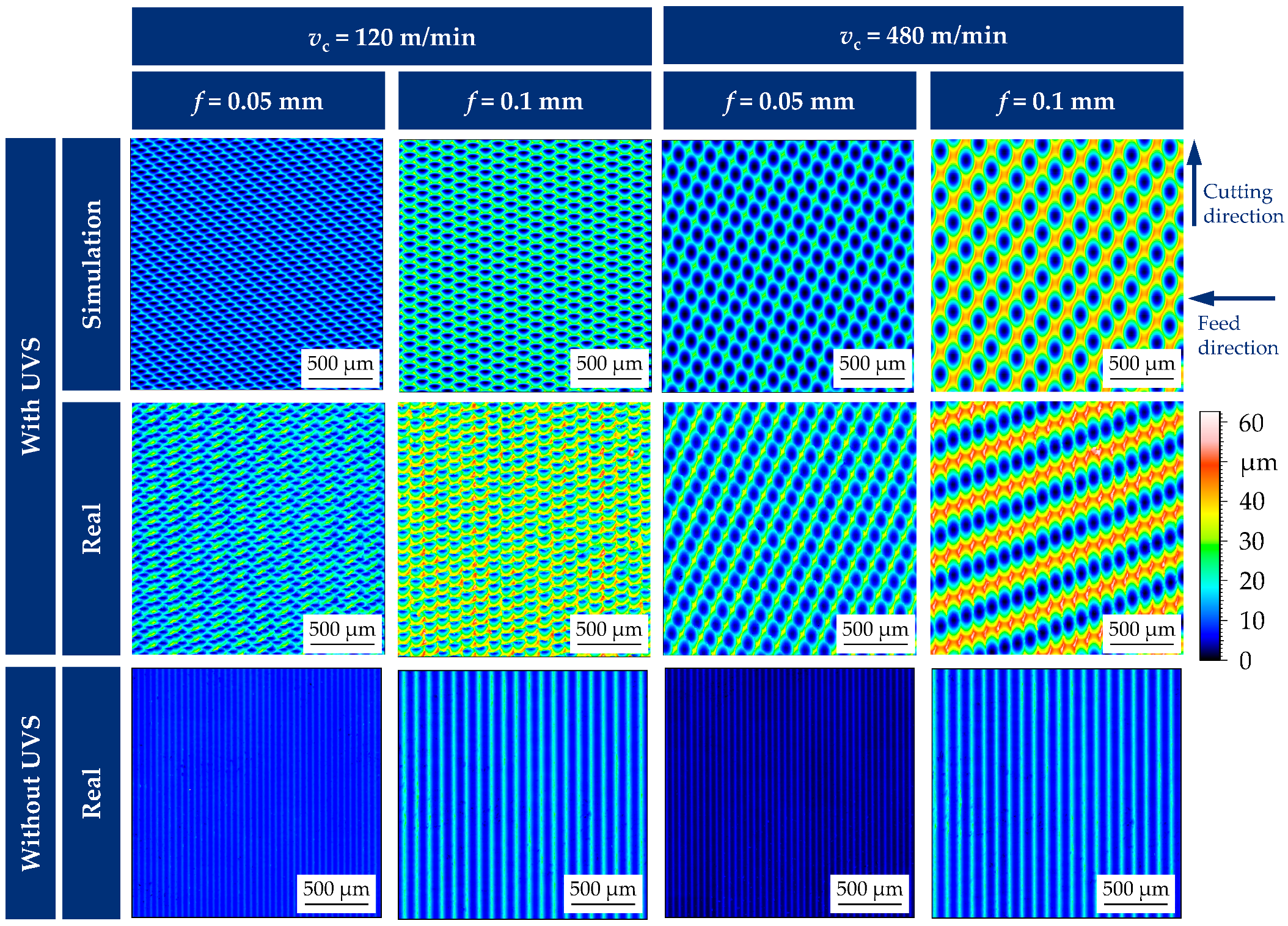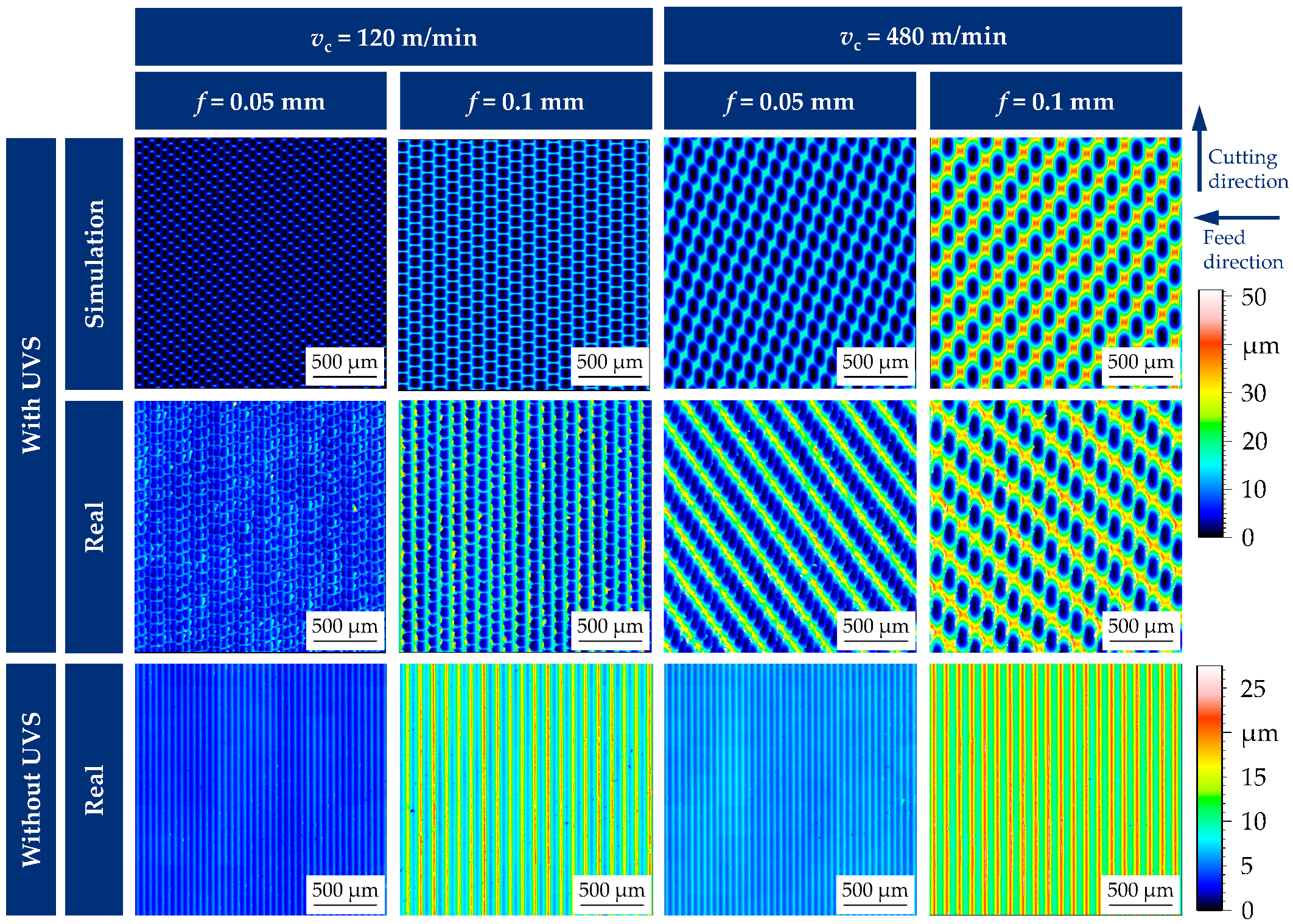 Figure 4, the influences of the cutting speed and the feed on the surface properties are shown. To enhance understanding of the mechanisms in the UVSM process, the results of the simulations are represented for comparison. Moreover, results from experiments realized without additional ultrasonic vibration superimposition (UVS) are visible.
