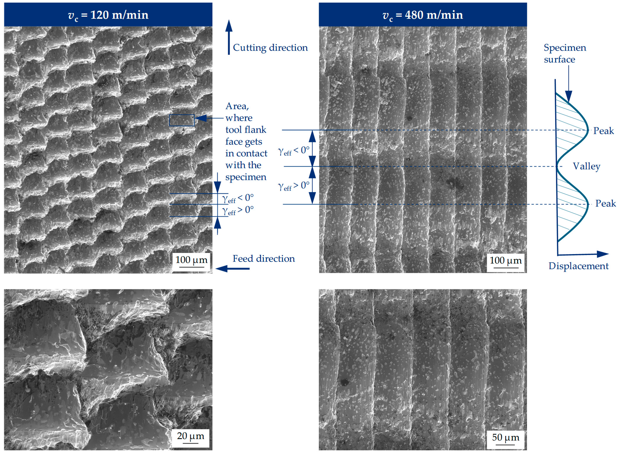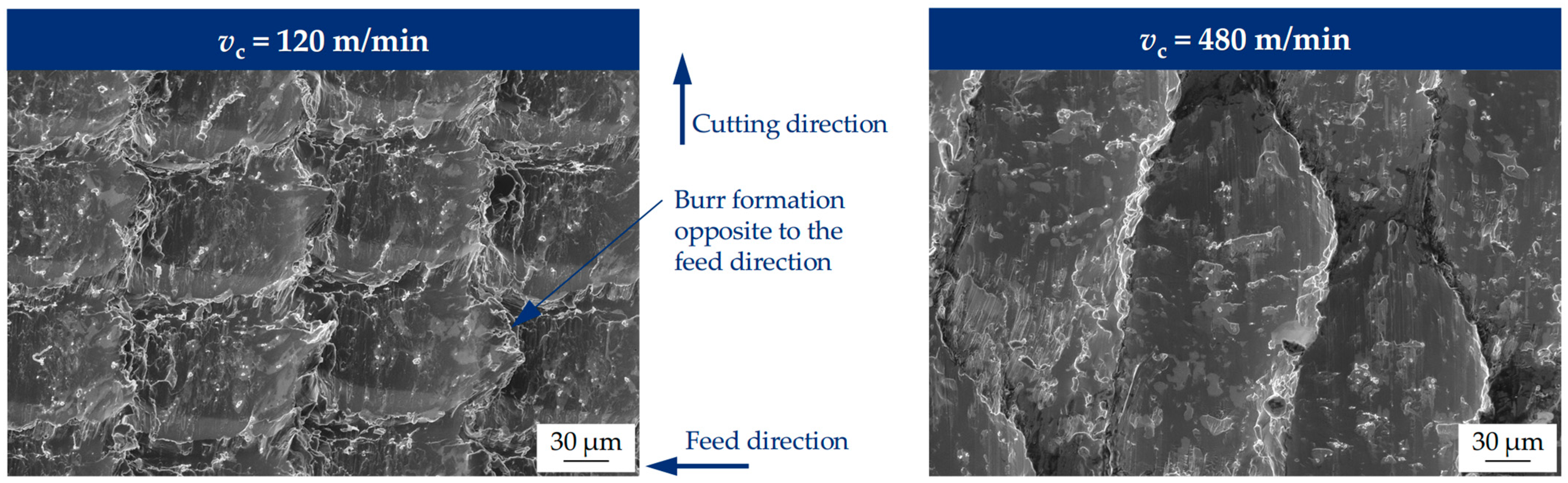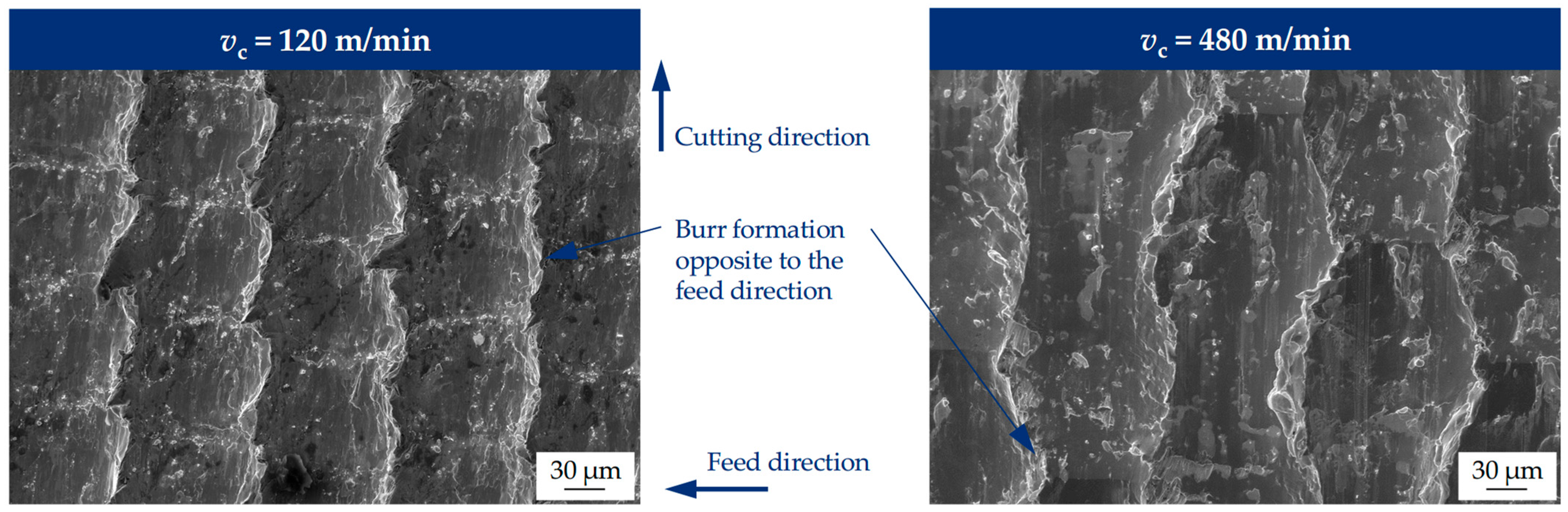 For the lower cutting speed analyzed, the flank wear land width is larger than the structure length. This involves continuous contact between the flank face and the resulting surface while machining. For the higher cutting speed regarded, the structure length is higher than the flank wear land width. Hence, due to the ultrasonic oscillation, there is an interrupted contact between the flank face and the machined surface. The biggest difference between the simulated and the machined surfaces is again the burr formation, which especially occurs in the feed direction. Due to the kinematics, the burr is deformed opposite to the feed direction. This is visualized more in detail by SEM micrographs shown in