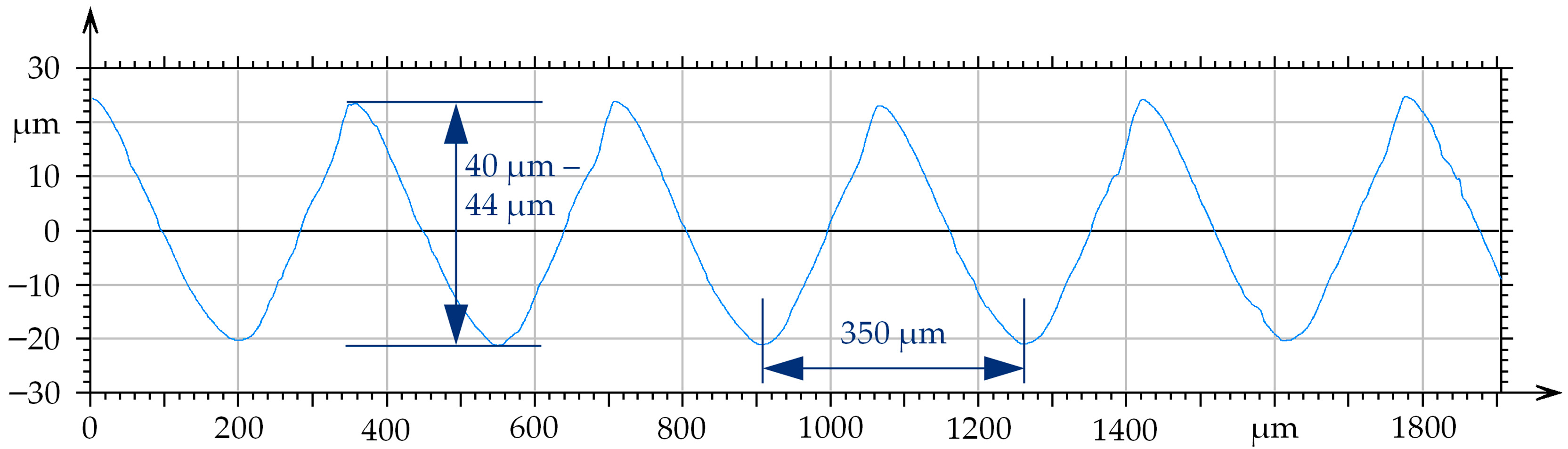Analyzing the profile shows that the measured structure length corresponds to the calculated value. However, due to the resonance control of the generator, small differences in frequency occurred. The measured structure heights at the surface are in the range between 40 µm and 44 µm.