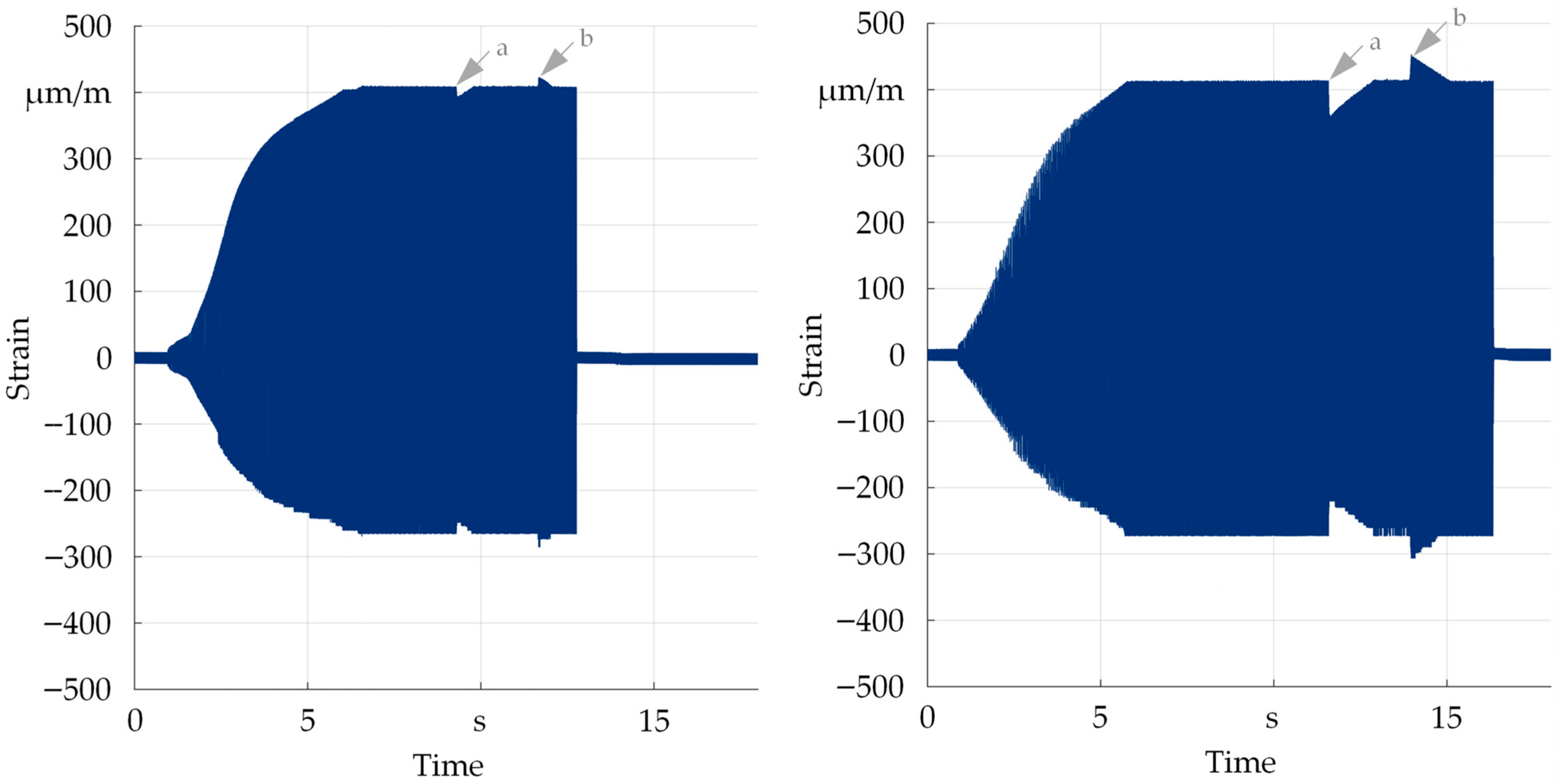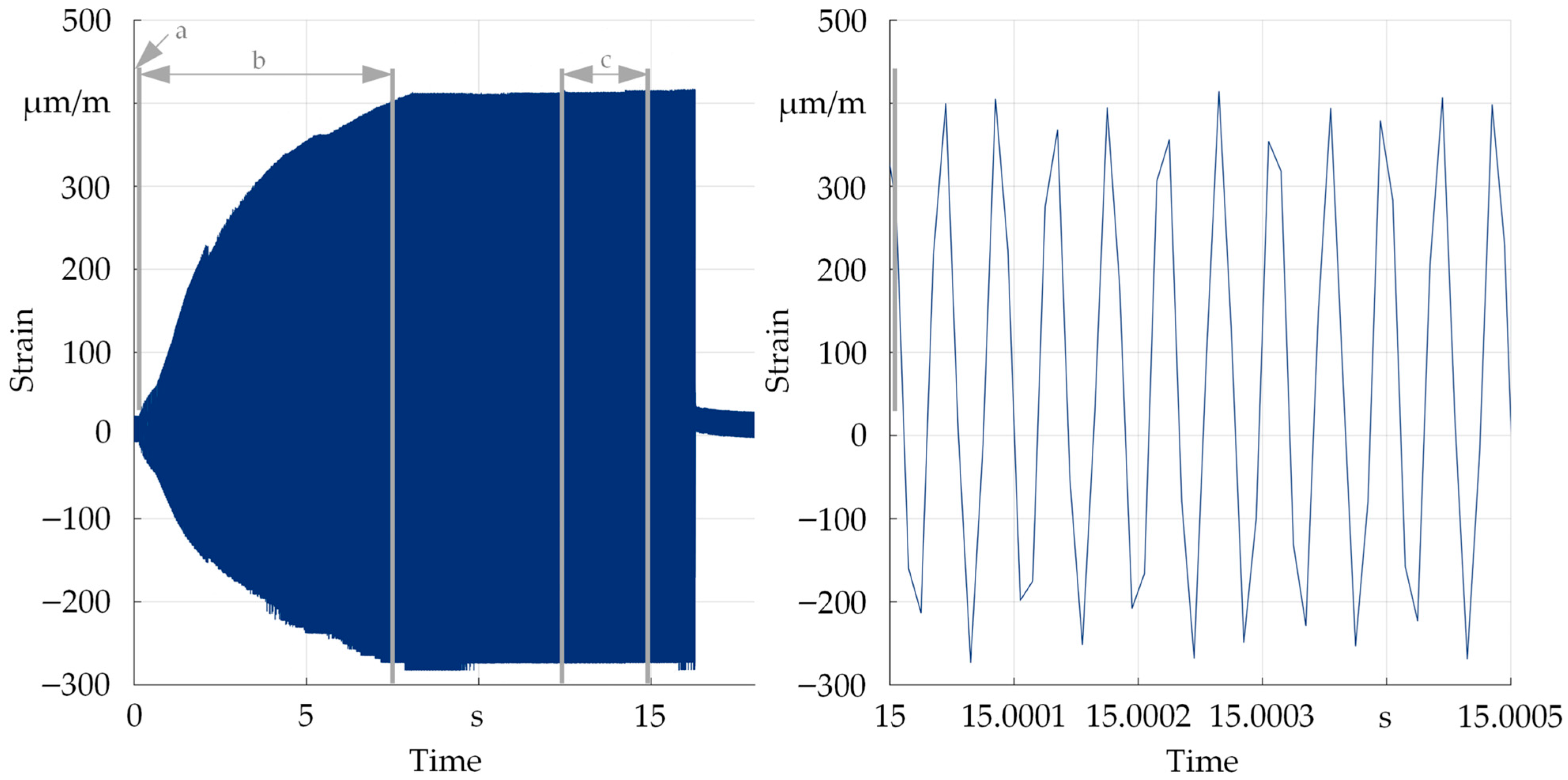 Figure 7 (left) shows the collected data of the strain measurement using the fiber Bragg grating. During the beginning of the measurement, there is a short time frame where only noise is measured, and the occurring strain is 0 µm/m (a). When the voltage supply of the generator is activated, the strain increases with an increasing supply voltage, which can be seen from 0.2 s to 7.5 s (b). The embedded control system of the generator adjusts the operating frequency of the system automatically. The turning process (c) started at 12.4 s, which cannot be detected with the setup in the time domain, as the compressive stresses resulting from the passive force during the turning process are small. A close-up view of the collected data, see