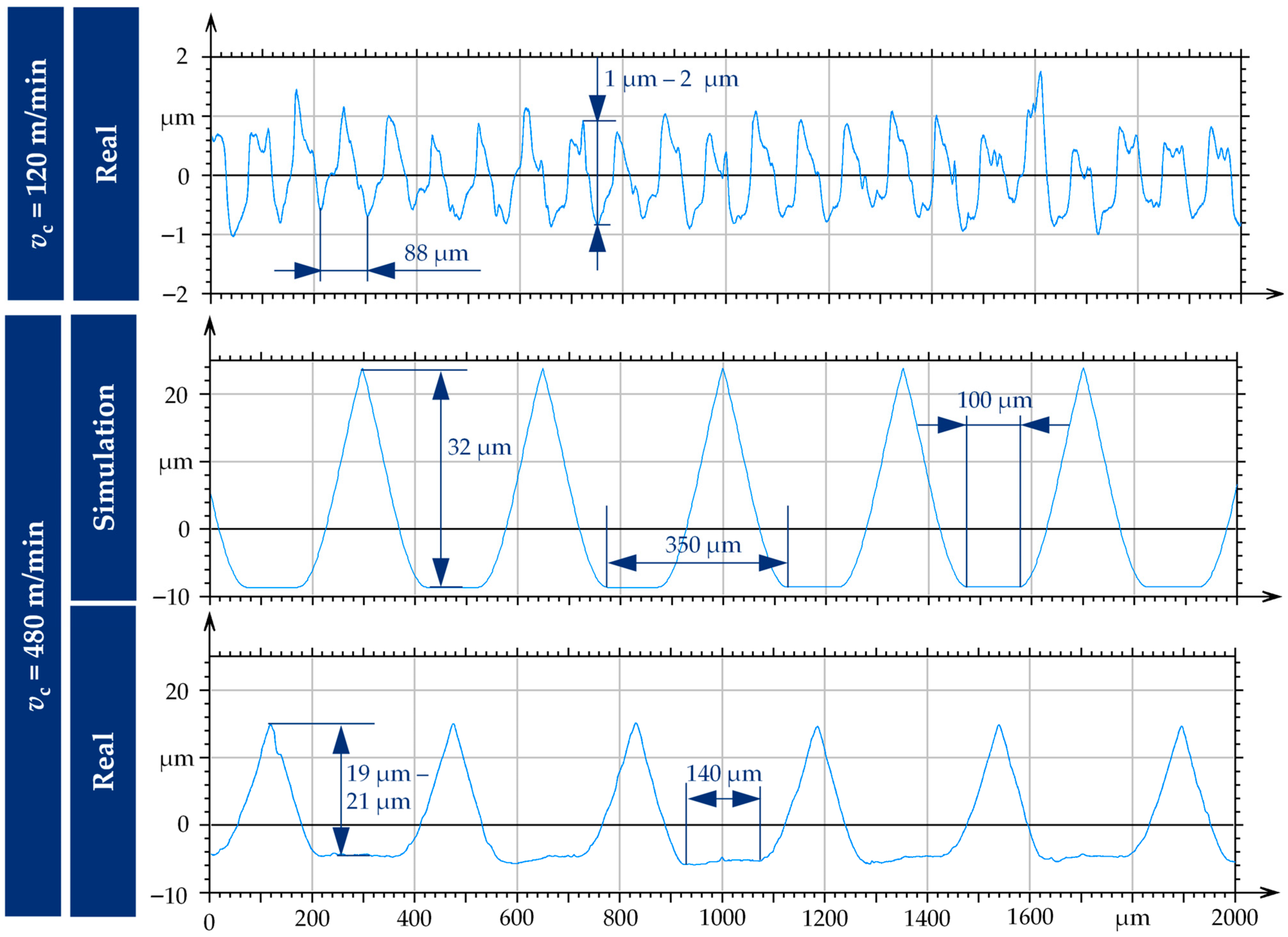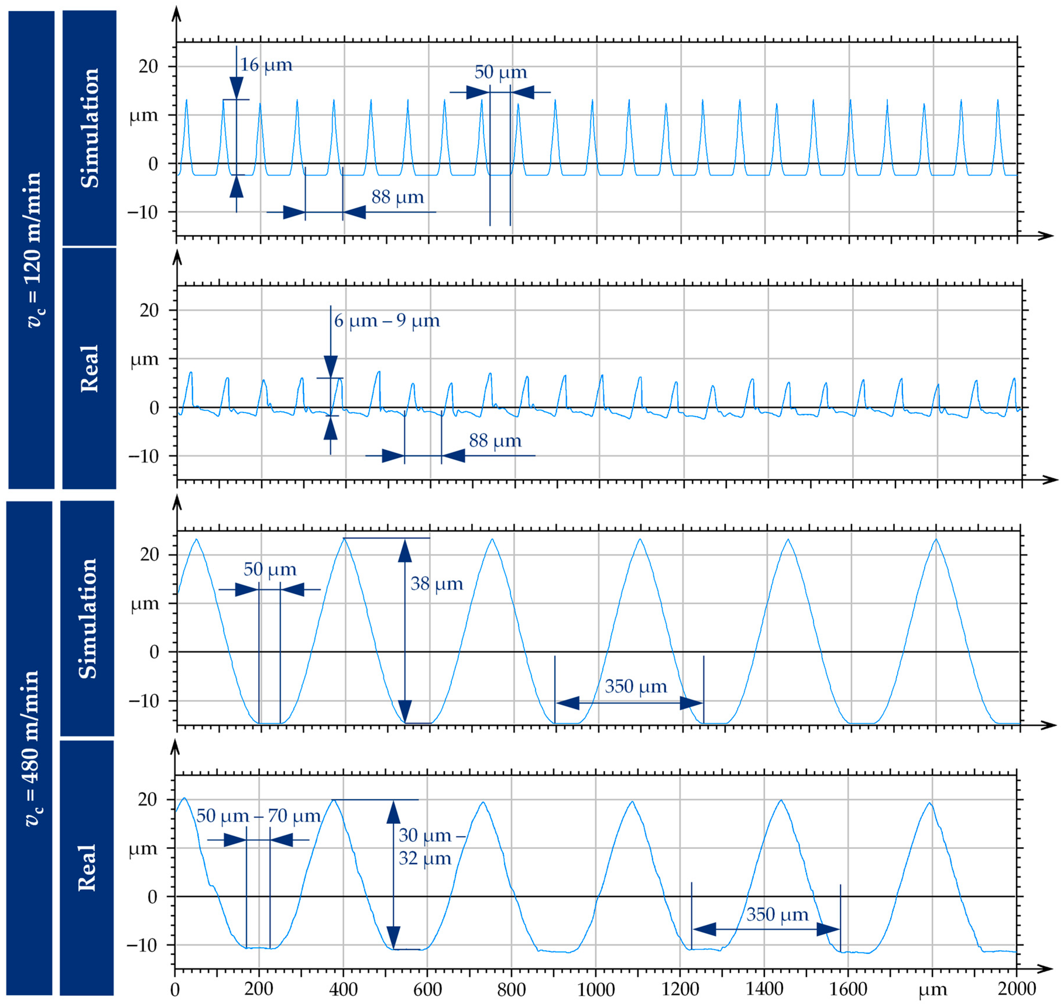 For the higher cutting speed regarded (480 m/min), analogous to the tools with a flank wear land width of 50 µm, the maximum amplitudes of the surface profile are higher in the simulations than after machining. Reasons for this are similar to machining with the tools with a 50 µm flank wear land width. However, the distance between the highest points remains unchanged (350 µm). The profile plateau at the deepest point of the surface profile doubles (140 µm). Hence, the surface peaks are less distinct.