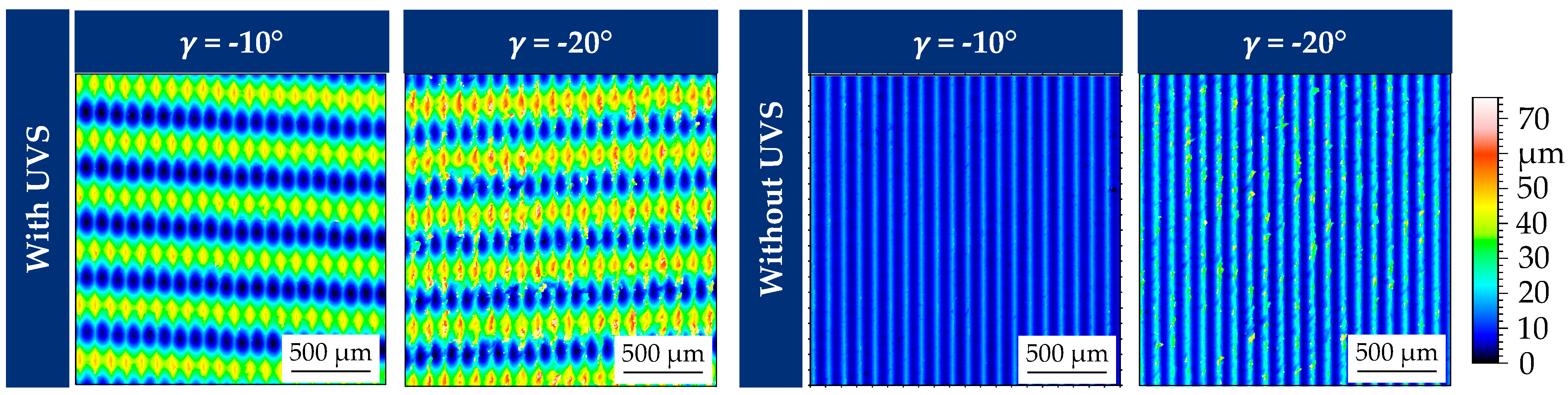 For machining without UVS, there is only a small difference between Sa and Spk values determined for the simulated and machined surfaces. For the machined surfaces, all determined values are higher in the case of UVSM compared to machining without UVS, which is explained by the additional peak-valley profile in the cutting direction, depending on the machining parameters, and the formation of burr.