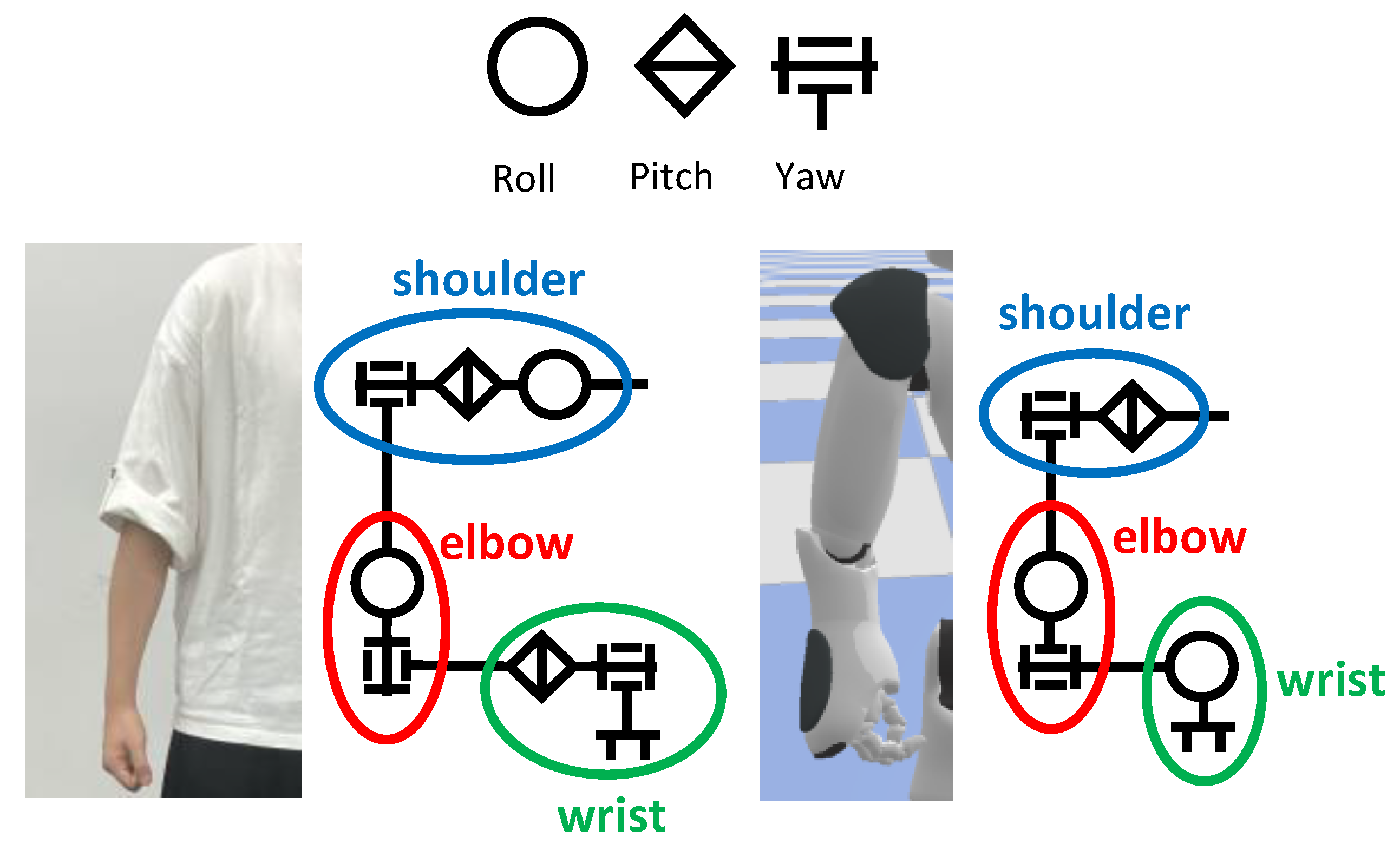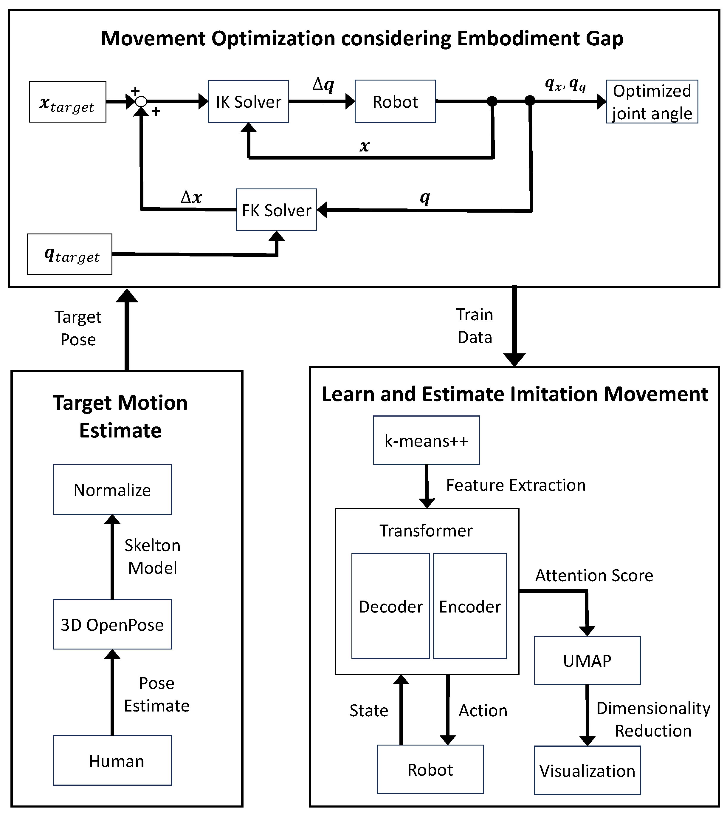 - Tanaka, M.; Sekiyama, K. Human-Robot Imitation Learning of Movement for Embodiment Gap. In Proceedings of the 2023 IEEE International Conference on Systems, Man, and Cybernetics (SMC), Cybern, Oahu, HI, USA, 1–4 October 2023; pp. 1733–1738. [Google Scholar]