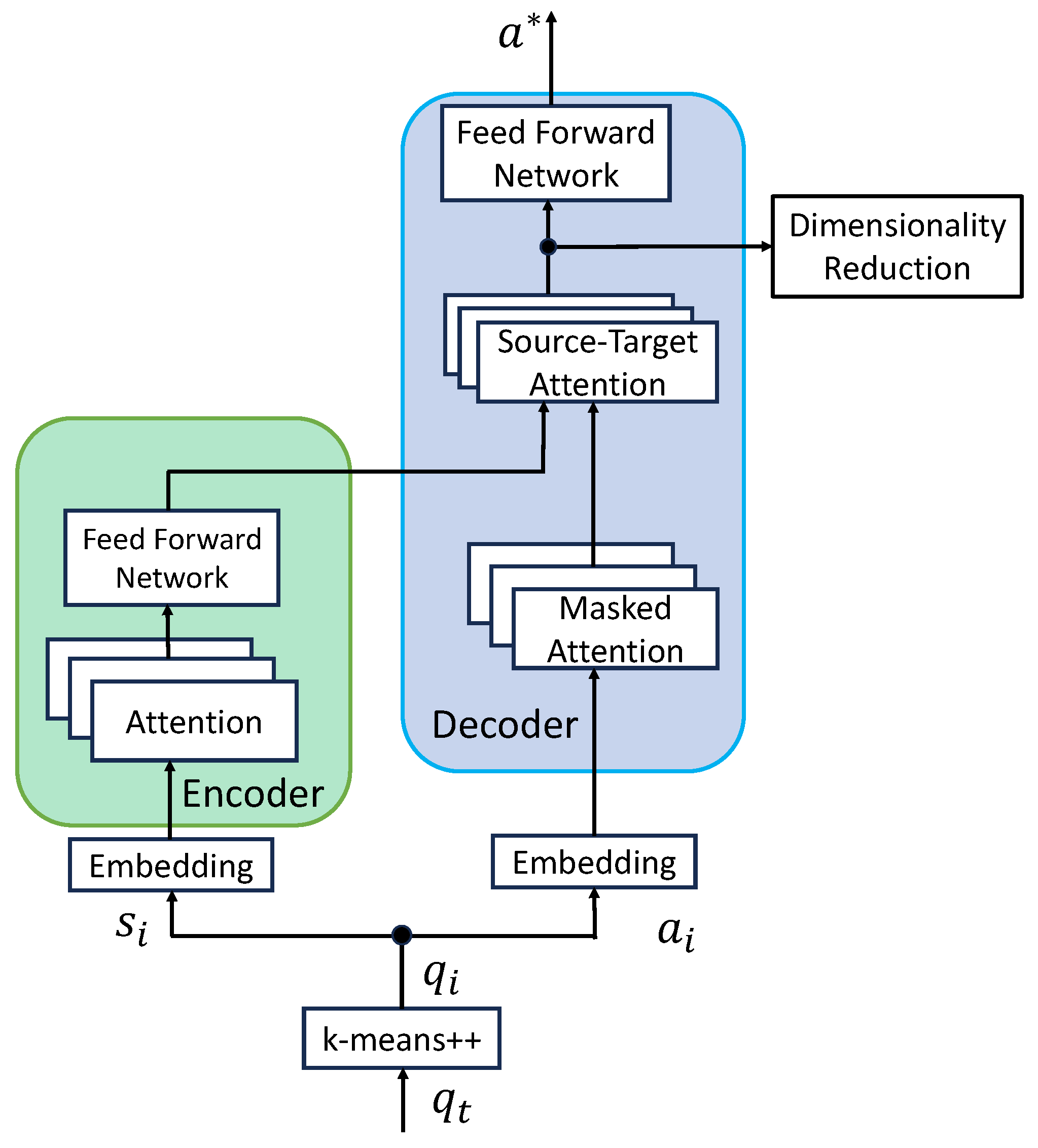 - Chen, L.; Lu, K.; Rajeswaran, A.; Lee, K.; Grover, A.; Laskin, M.; Abbeel, P.; Srinivas, A.; Mordatch, I. Decision Transformer: Reinforcement Learning via Sequence Modeling. arXiv 2021, arXiv:2106.01345. [Google Scholar] [CrossRef]