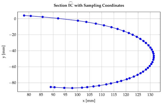 The sampling process for section is shaped by both the precision of the measuring tools and the requirement to preserve geometric continuity along the blade’s superficial profile (Figure 2). The angular position of point B is approximately , while point C is located at . To ensure a consistent sampling resolution using 1-degree intervals, at least 48 distinct observations are required. Each observation corresponds to a unique radial distance (radius), and for analytical purposes, each is treated as an independent and identically distributed (i.i.d.) sample.