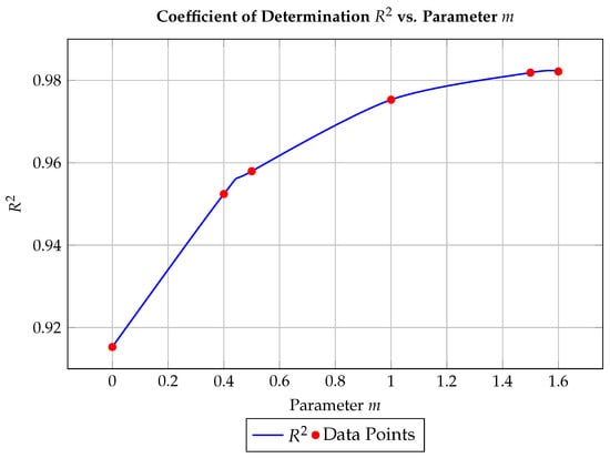 The influence of the angular exponent parameter m on the model’s performance is analysed in Figure 7, where is plotted as a function of m. The curve reveals a distinct optimum where reaches its maximum, indicating that appropriate tuning of m enhances the fit without overfitting. This sensitivity analysis confirms that the proposed transformation terms provide both flexibility and stability across varying sampling densities.