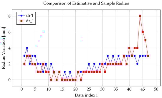 The dispersion levels identified in Section 2.4, namely a standard deviation of mm for linear measurements and rad for angular readings, establish the expected uncertainty range in the sampled data. Accordingly, the residual variance observed in the regression fitting is consistent with these precision limits, confirming that the deviations between measured and predicted radii are primarily attributable to instrument resolution rather than model inadequacy.
